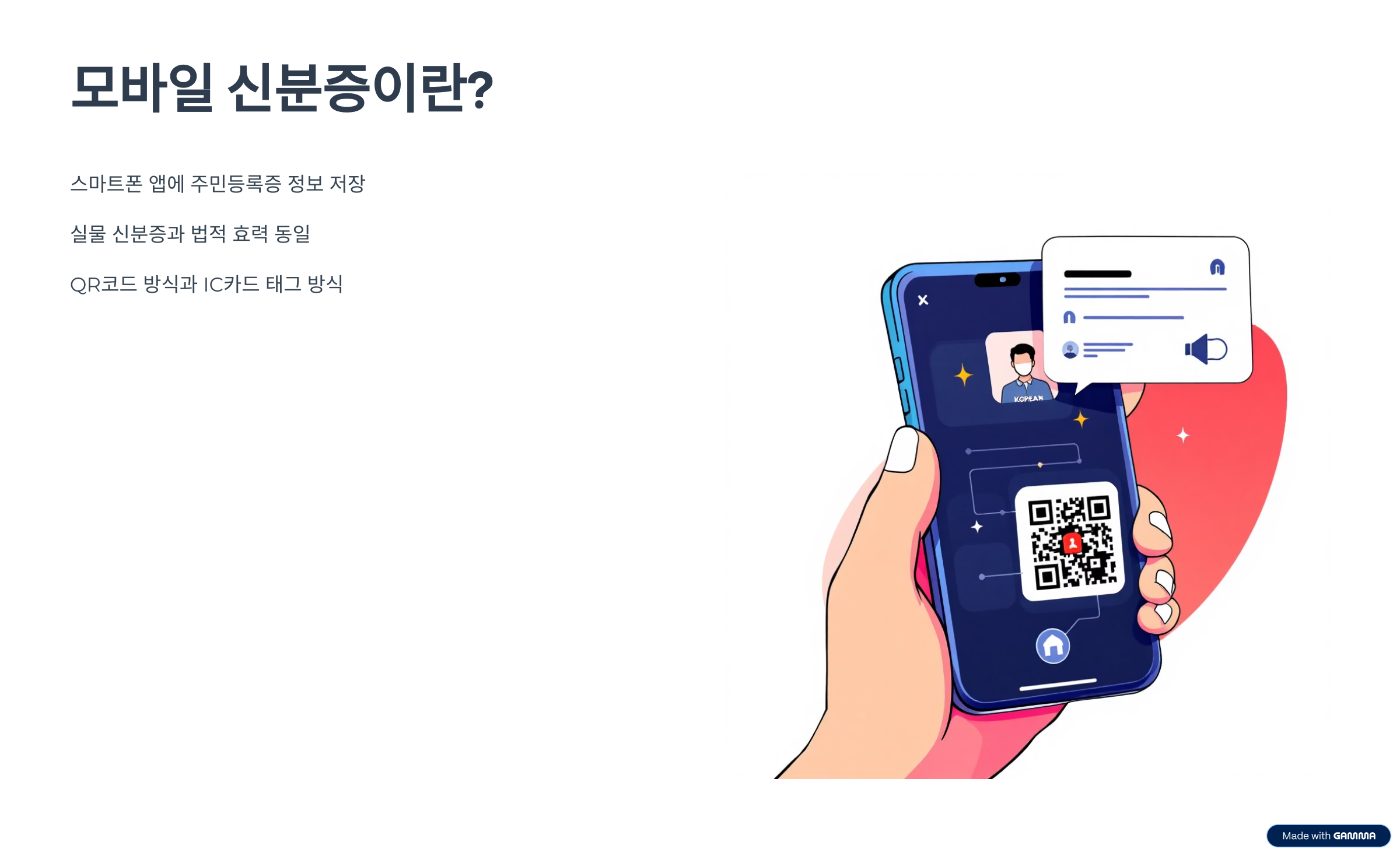 휴대폰 하나로 은행 업무, 공공기관 민원, 편의점 성인 인증, 렌터카 계약 등 거의 모든 일상 속 인증이 가능해지죠. QR코드 방식과 IC카드 태그 방식, 두 가지로 나뉘며 사용자의 상황에 따라 선택 가능합니다.