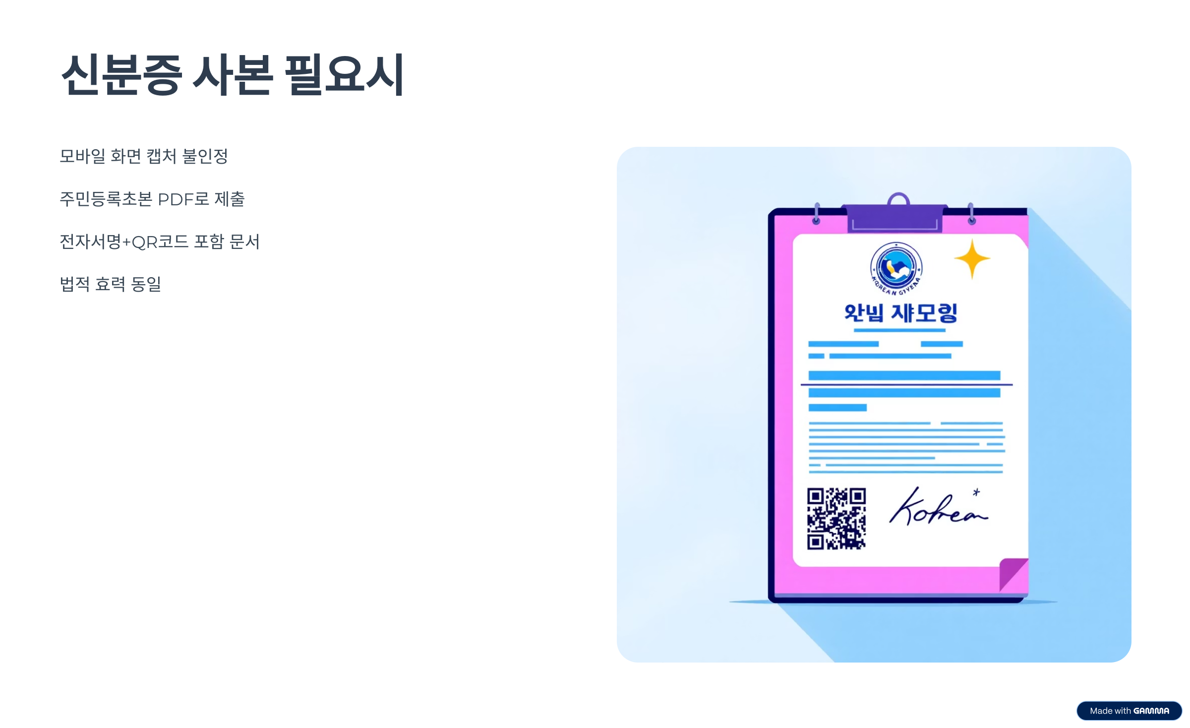 전자서명 + QR코드 포함 문서로, 종이보다 신뢰도가 높고 법적 효력도 동일합니다.