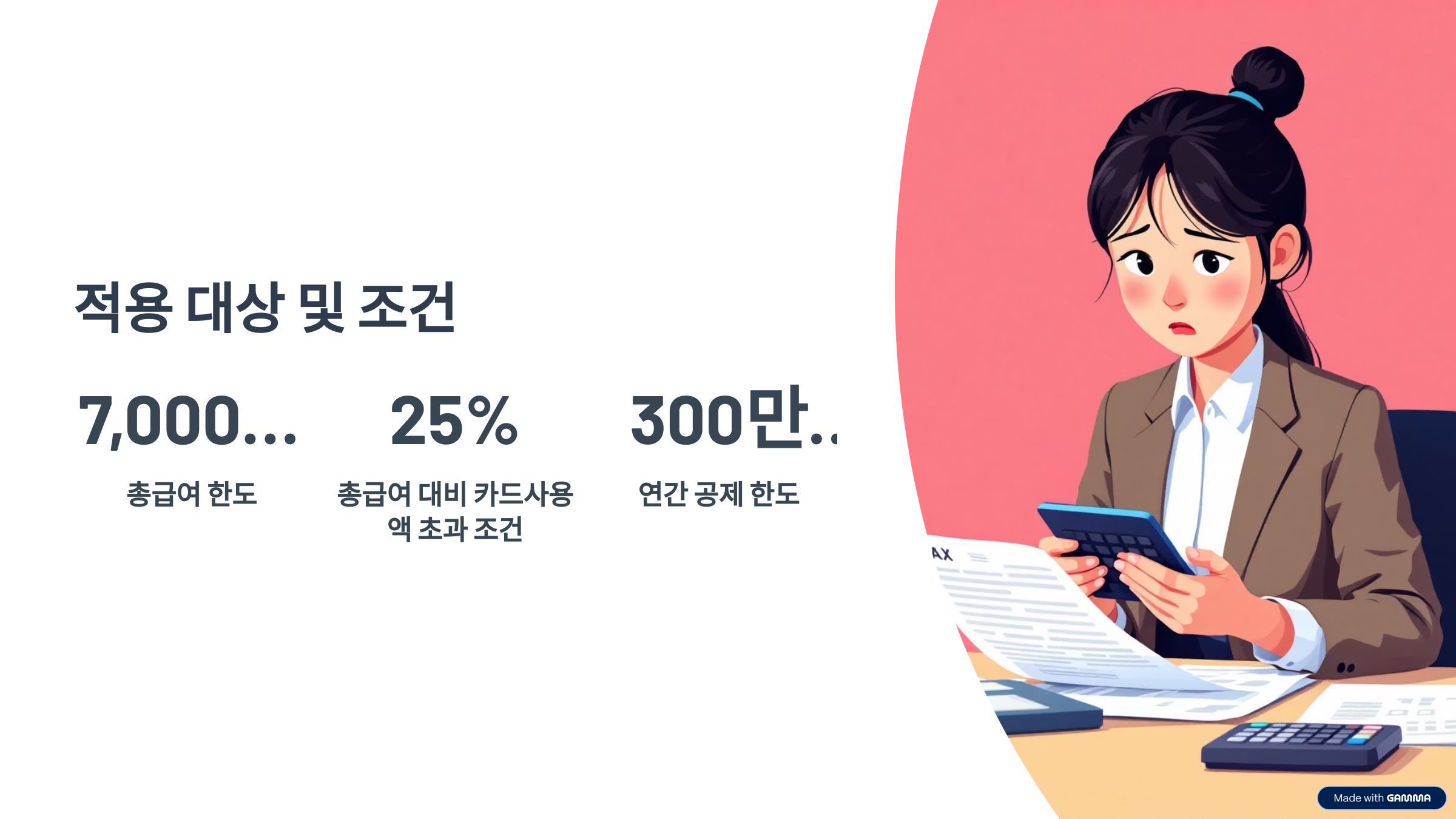 연간 300만 원 한도 내에서 전통시장, 대중교통, 문화비를 합쳐 공제되며, 총 급여액 7,000만 원 이하이면서 카드 사용액이 총급여의 25%를 초과한 경우에만 적용됩니다. 즉, 공제를 받으려면 다음을 충족해야 합니다.
