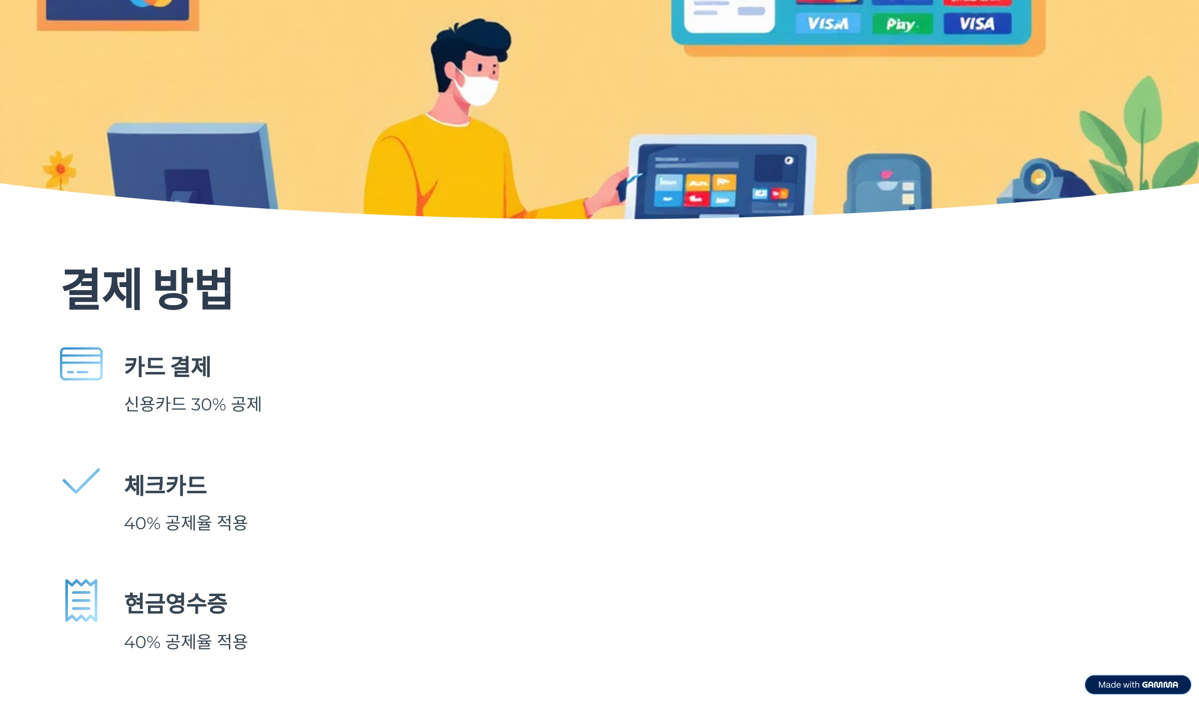 - 공제율은 신용카드 30%, 체크카드 및 현금영수증 40%
