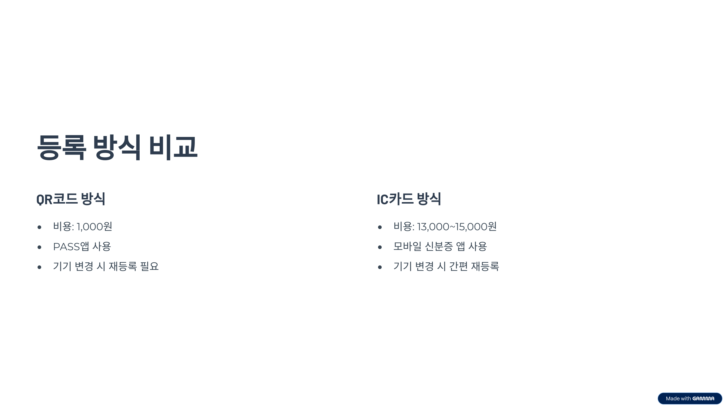 - 등록 방식은 QR코드(간편형) vs **IC카드(보안형)**으로 나뉨