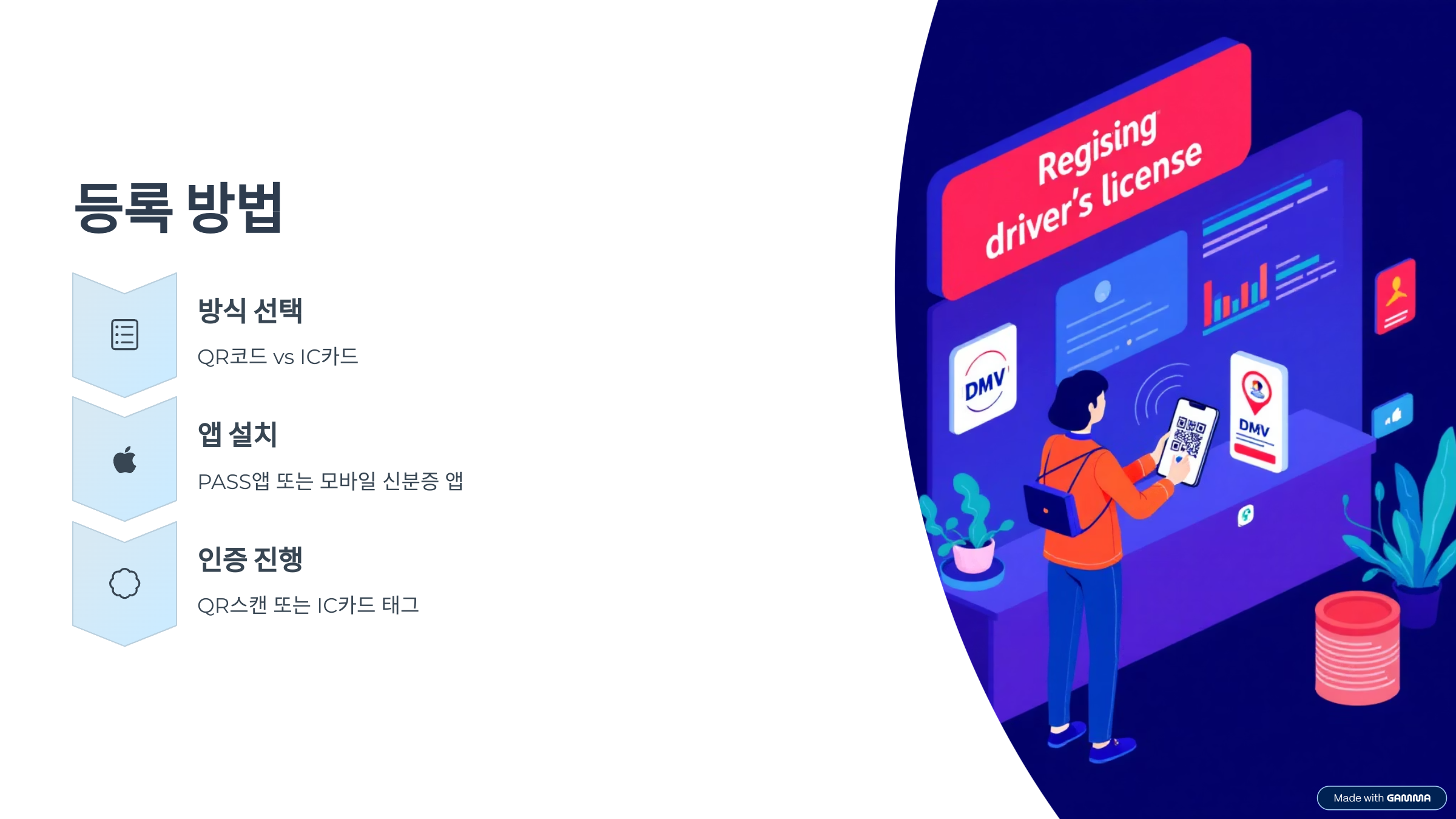 - QR 방식 재등록: 운전면허시험장 재방문 필요, QR코드 재스캔