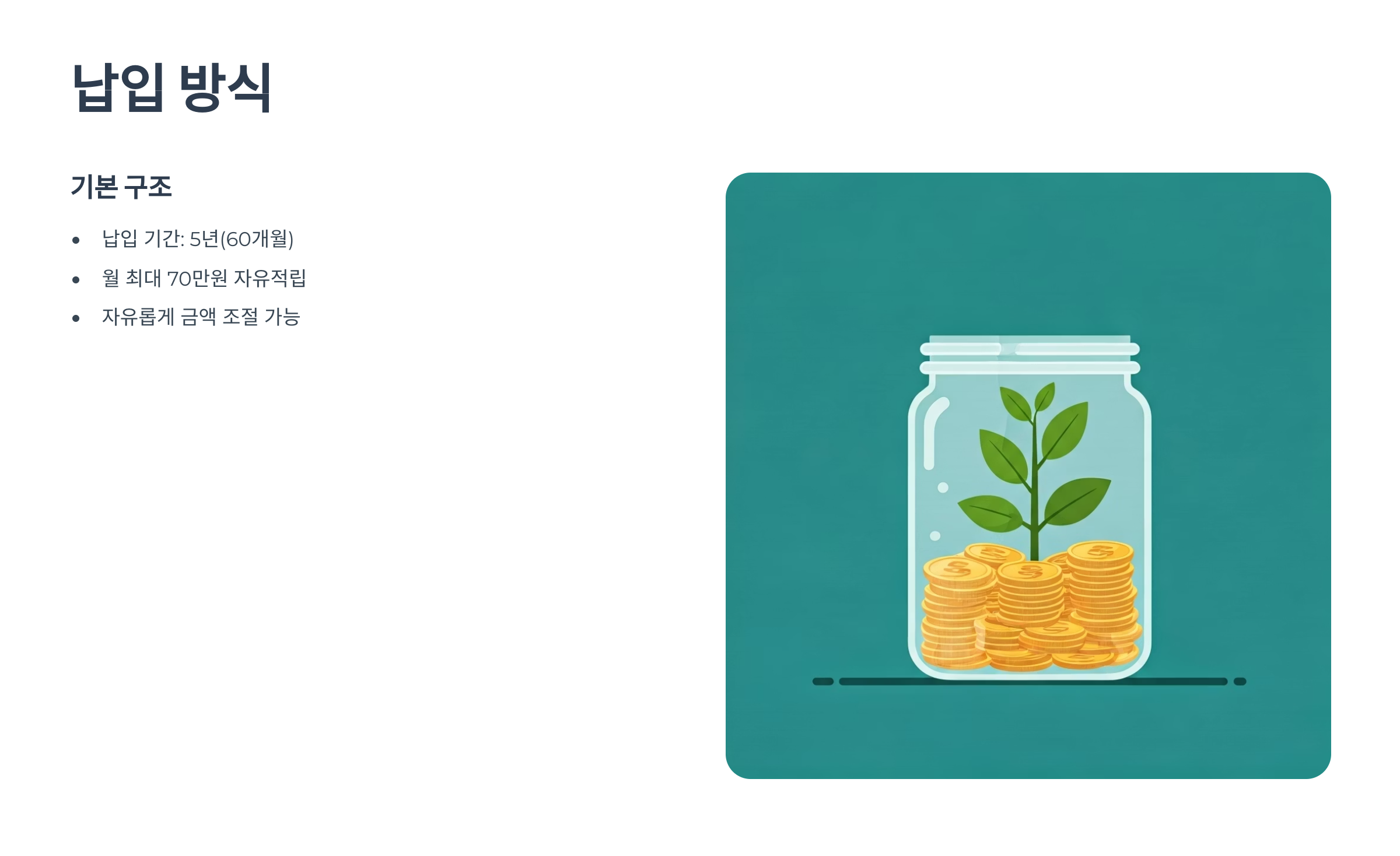 - 납입 방식: 월 최대 70만 원까지 자유롭게 적립