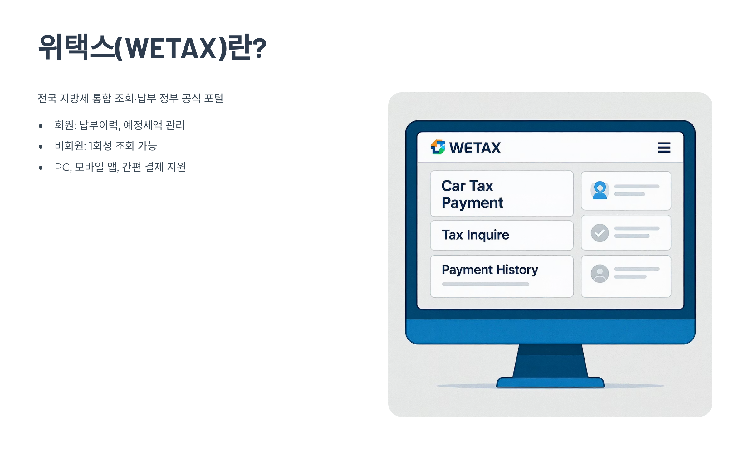 위택스(WETAX)는 전국 지방세를 통합 조회·납부하는 정부 공식 포털이에요. 서울 지역은 따로 ‘이택스’라는 플랫폼이 있지만, 그 외 지역에서는 모두 위택스 이용이 가능해요. 비회원 조회부터 회원가입 이용까지 모두 지원되어 편리하게 사용할 수 있어요.