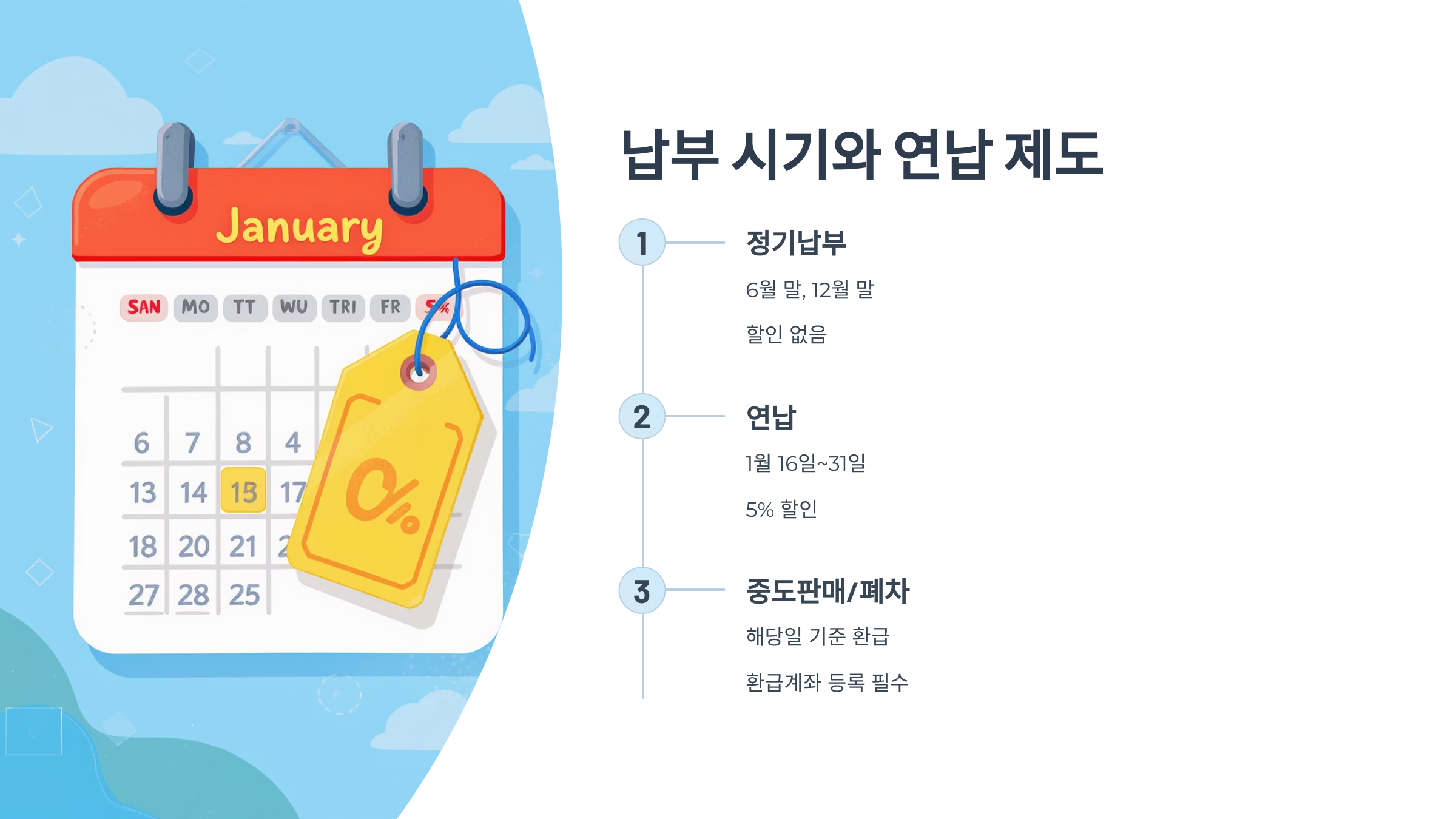 중도판매/폐차 시 | 해당일 기준 환급 가능 | 납부 후 잔여기간 반환 | 환급계좌 등록 필수 |