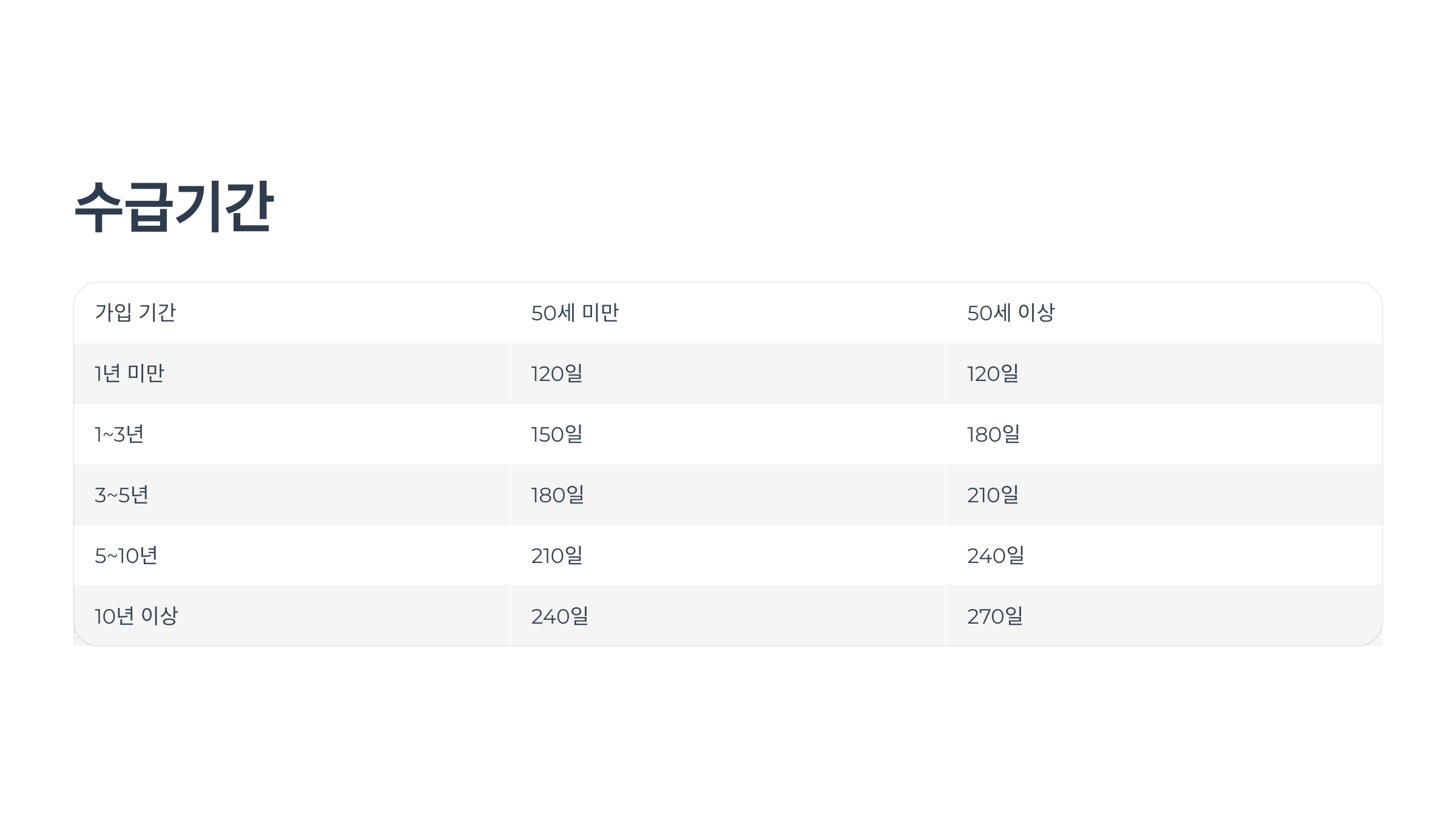 수급 기간은 가입 기간과 만 나이에 따라 다르게 책정됩니다:
