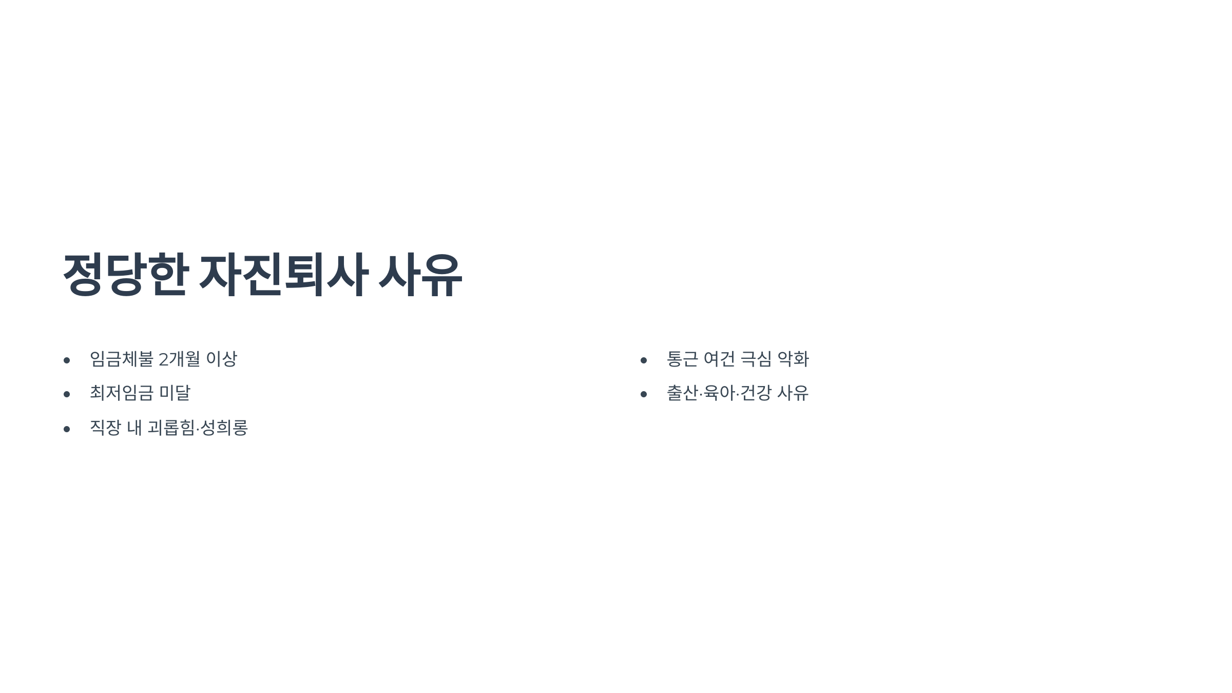 - 예: 임금체불 2개월 이상, 최저임금 미달, 직장 괴롭힘, 출퇴근 극심한 통근 여건, 임신·출산·육아 등 일정 의무…