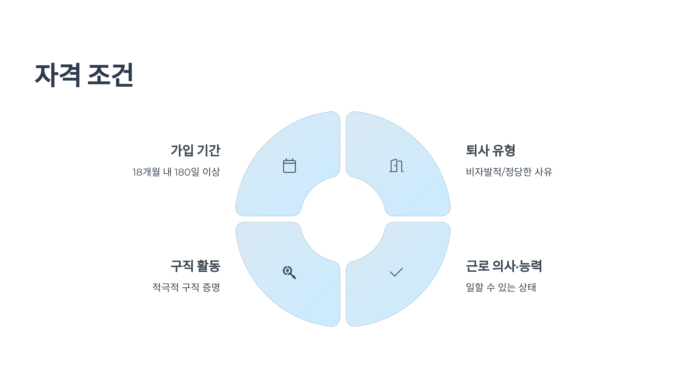 - 실업급여는 가입 기간·퇴사 유형·구직 조건·의지를 모두 충족할 때 받을 수 있습니다.