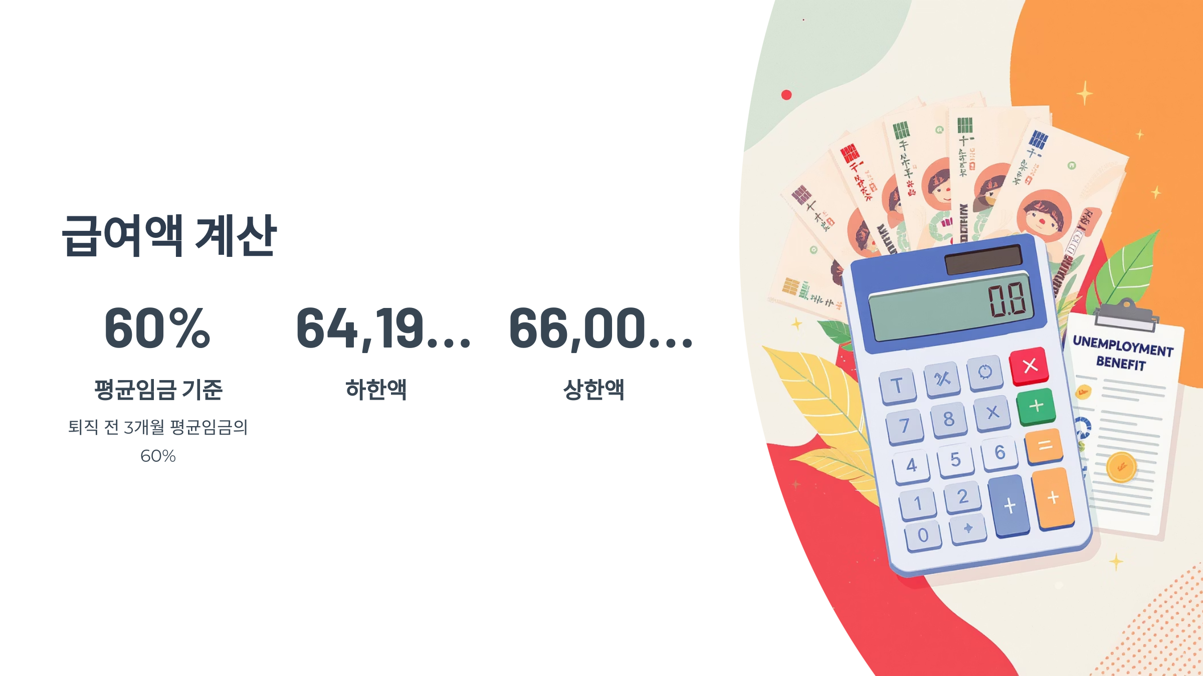 실업급여는 퇴직 전 3개월 평균임금의 60%를 기준으로 산정되며, 아래 기준에 맞춰 조정됩니다(2025년 기준 세계):