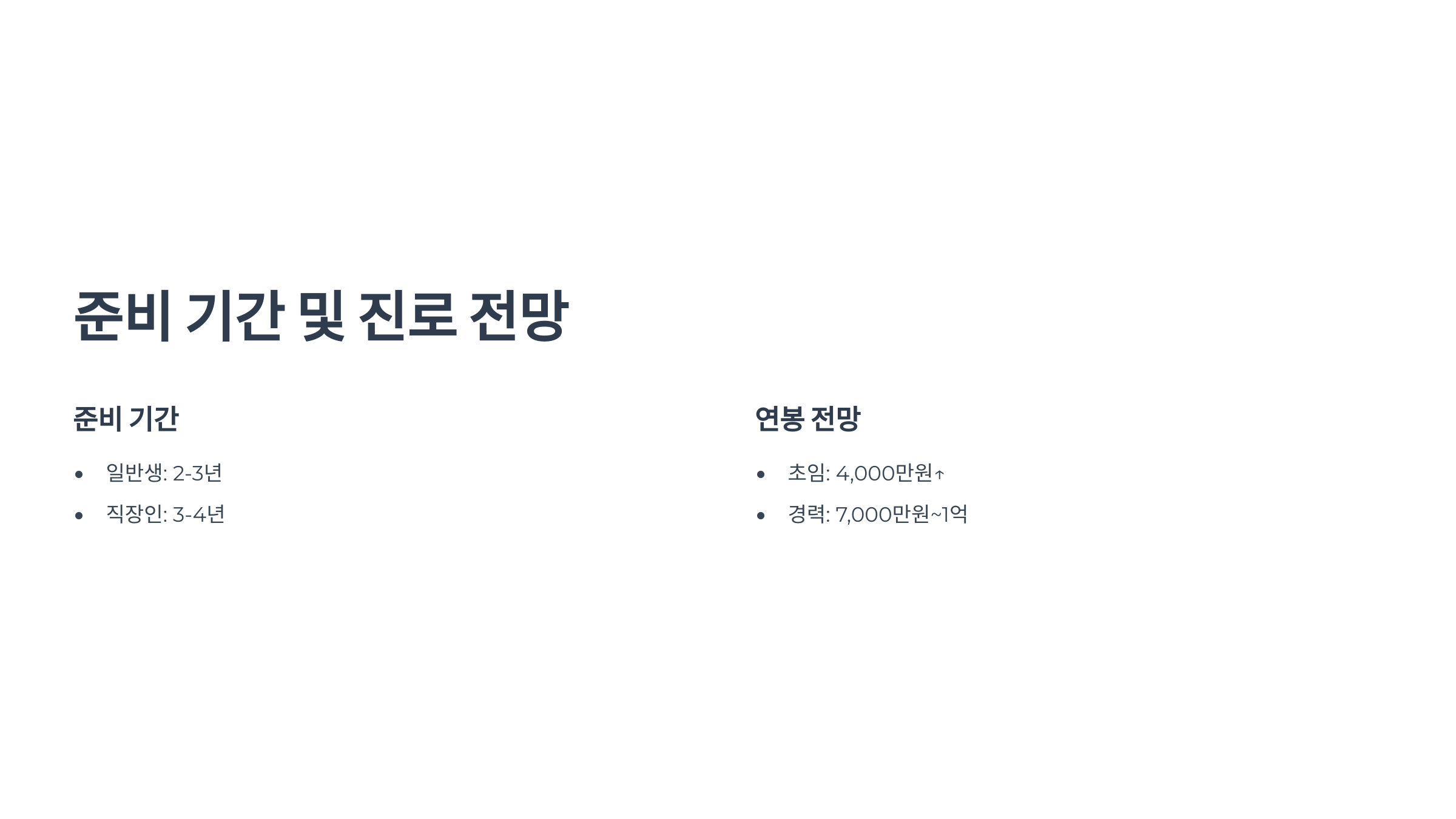 • 직장인/병행생: 3~4년 이상 장기 플랜 권장
