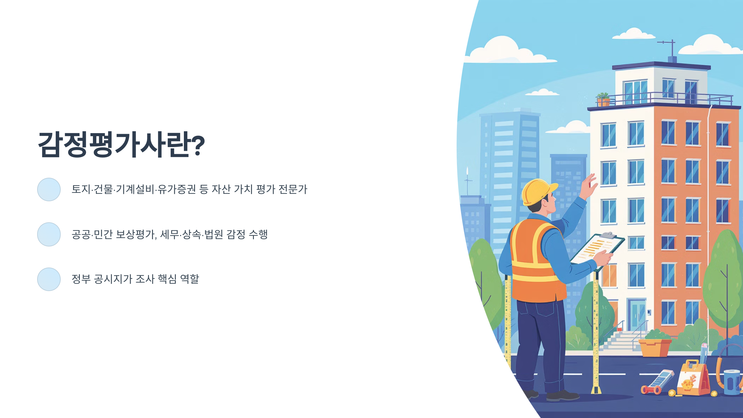 감정평가사는 토지·건물·기계설비·유가증권·영업권 등 다양한 자산의 경제적 가치를 평가하는 전문가로, 공공·민간 보상평가, 세무·상속·법원 감정까지 광범위한 업무를 수행합니다. 법률·회계·부동산 전문지식을 바탕으로 공정한 가치판단을 제공하며, 정부 공시지가 조사에도 핵심 역할을 합니다. 단순 중개를 넘어 사회적 신뢰와 공신력을 갖춘 전문직으로 꼽히고 있습니다.
