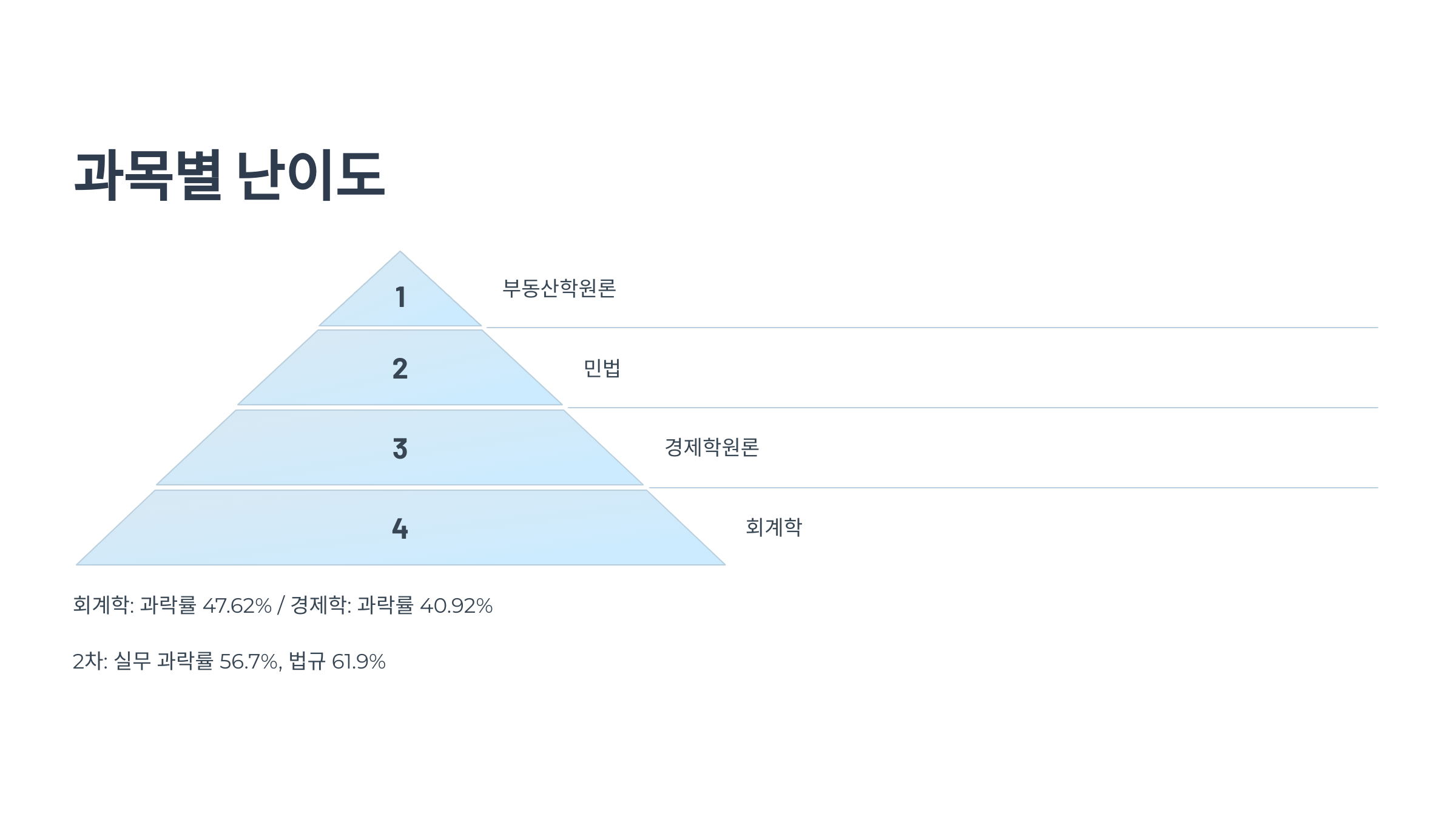 - 과목 난이도: 회계학·경제학 난도가 높으며, 부동산학원론은 상대적으로 평이