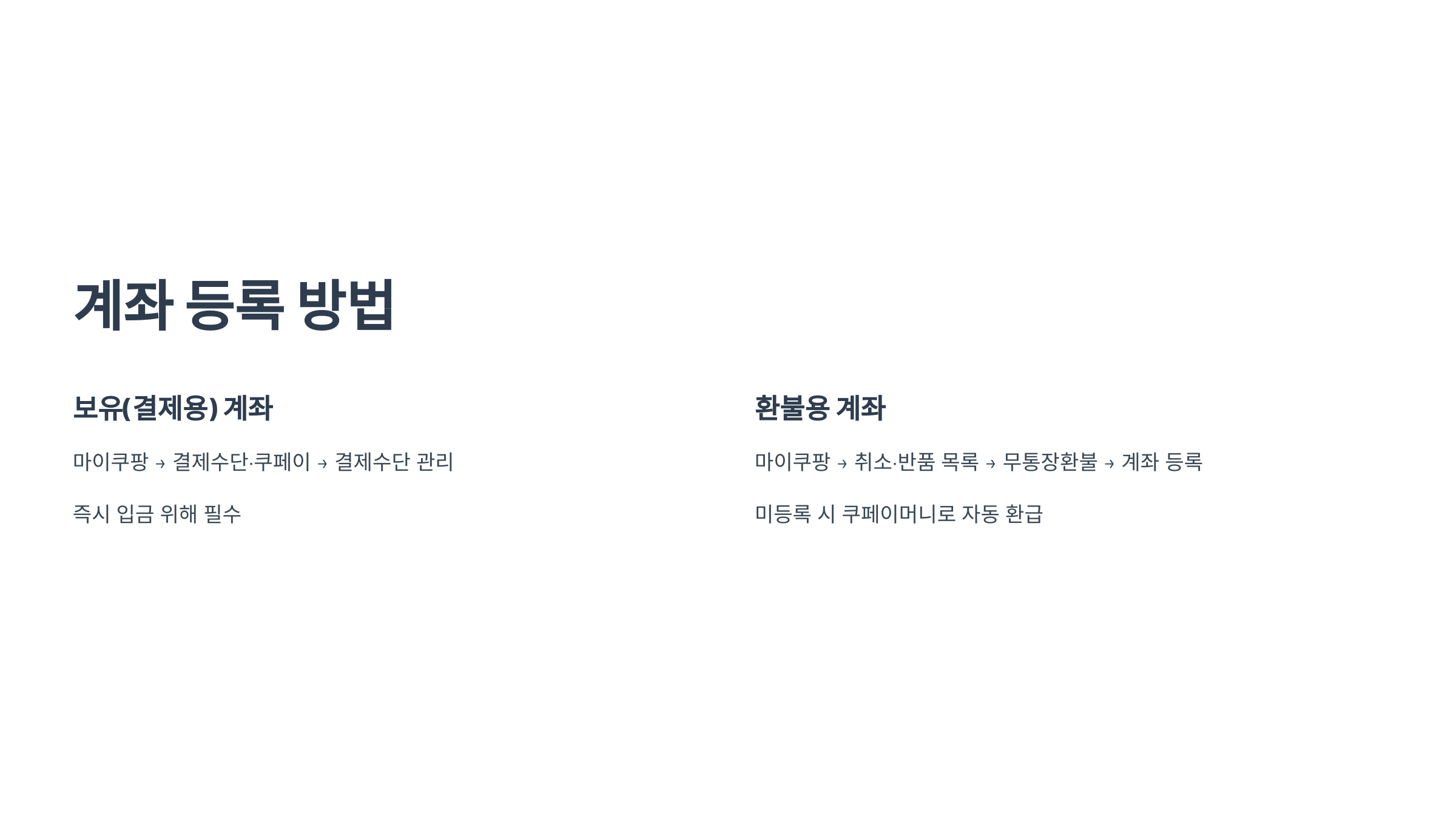 - 마이쿠팡 → 취소·반품 목록 → 무통장환불 → 계좌 등록