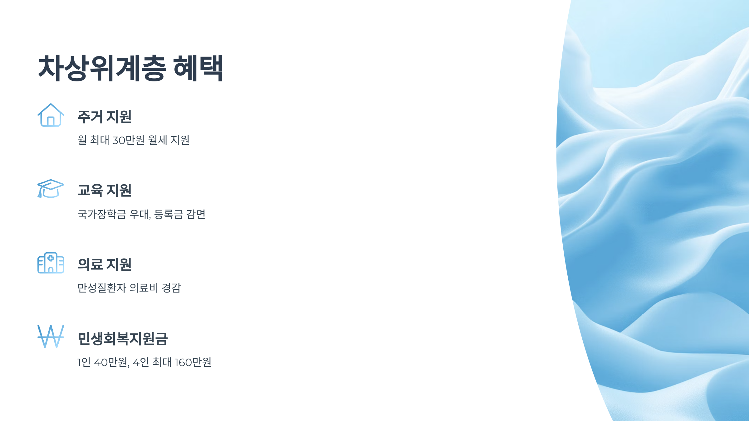 차상위계층으로 인정되면 받을 수 있는 혜택은 크게 의료·교육·주거·공공요금·문화·청년·기타로 나눌 수 있습니다.