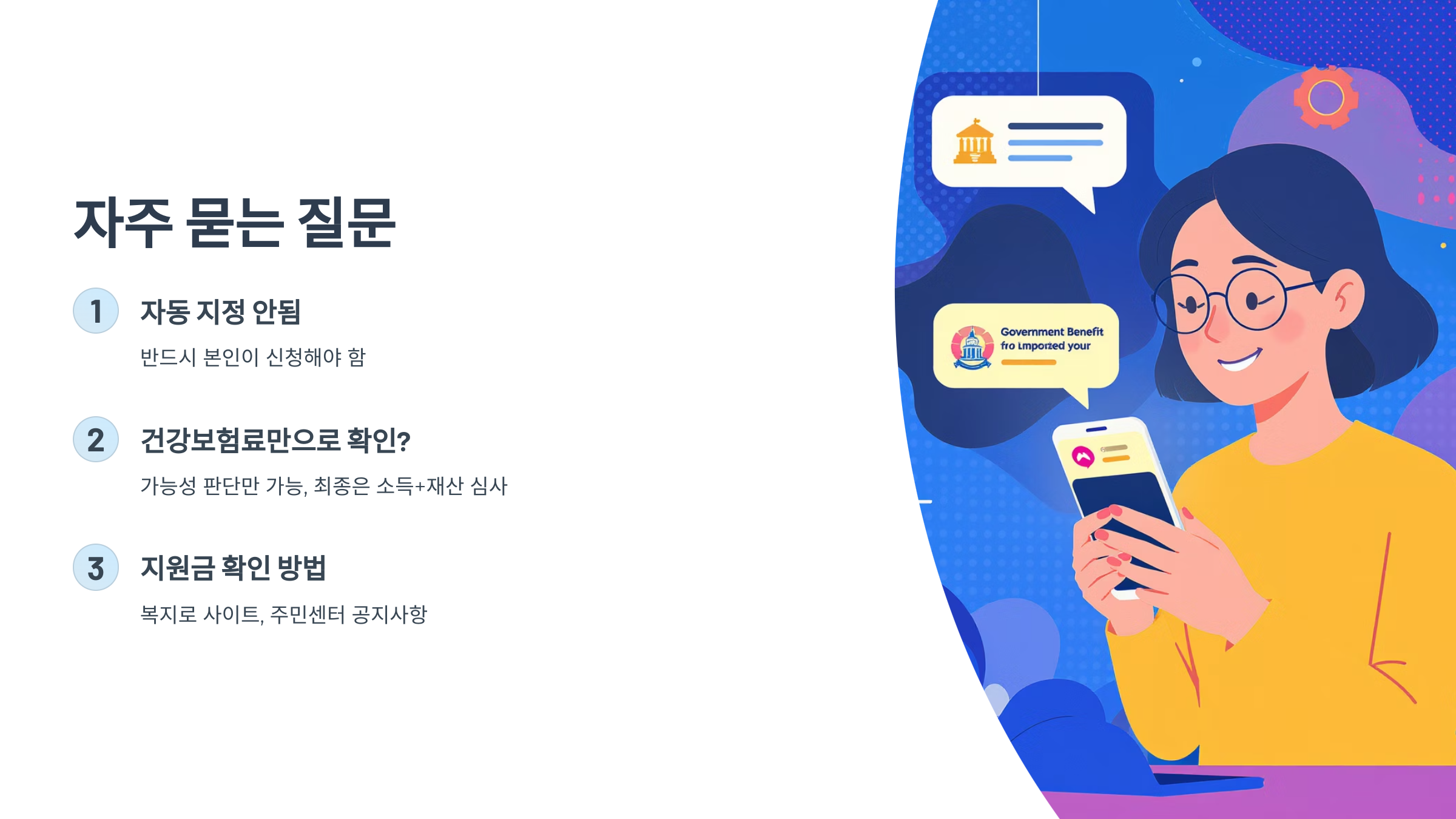 - 또한, 지역별 기준이 적용되기 때문에, 자동차나 부동산이 일정 기준 이상일 때는 자격에서 제외될 수 있습니다.