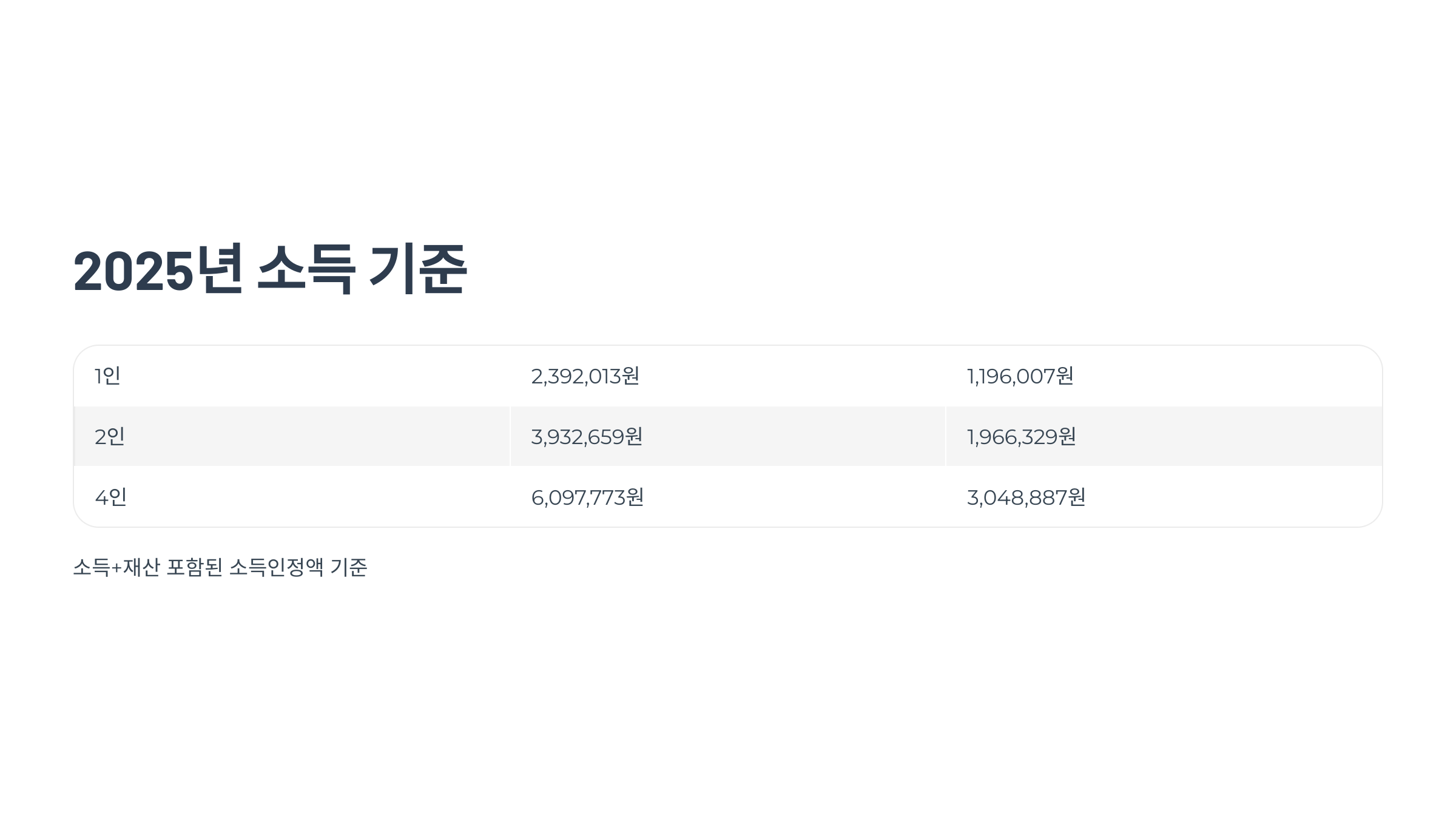 (※ 상기 수치는 ‘소득 인정액 기준’이며, 실제 적용 시는 소득+재산이 포함됨을 유념해 주세요.)