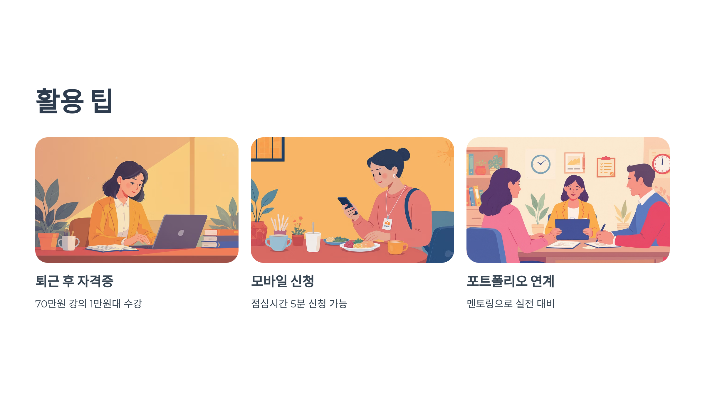 또한, 훈련장려금, 수료장려금, 포트폴리오 제작 지원, 이력서·면접·채용정보 연계 지원 등 다양한 부가 혜택도 제공됩니다.