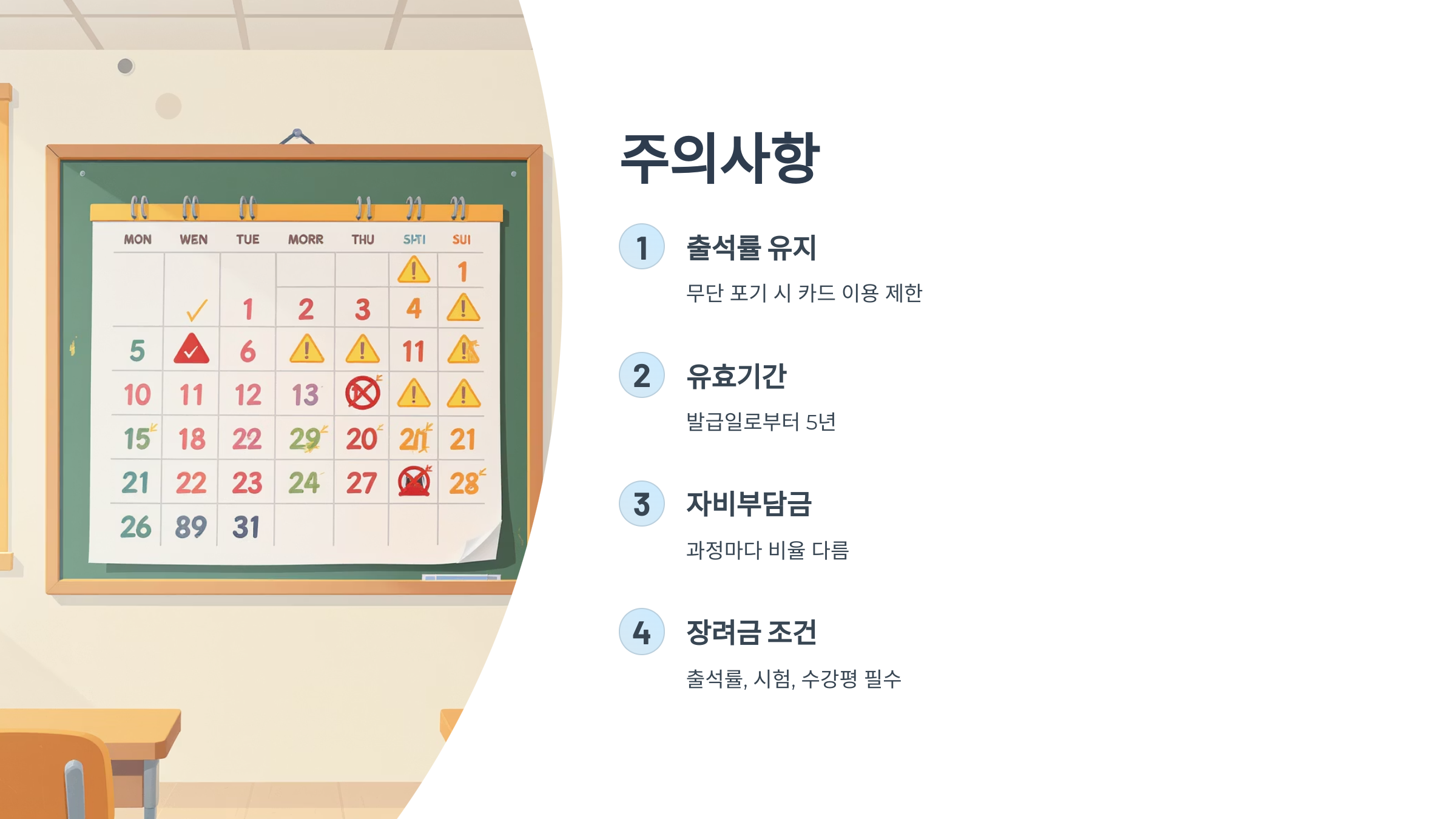 1. 무단 수강 포기 시 카드 이용에 제한이 생길 수 있으니 반드시 출석률을 지켜주세요.