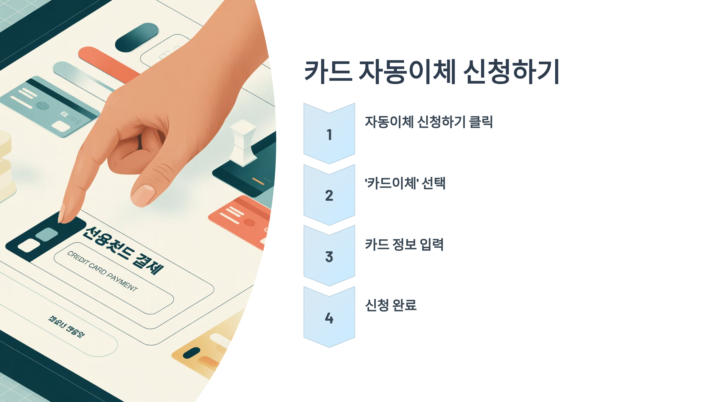 '카드'를 선택하셨다면, 이제 본인 명의의 신용카드 또는 체크카드 정보를 입력하는 단계입니다. 카드 번호, 유효기간, 비밀번호 등을 정확히 입력해 주세요. 모든 정보를 입력하고 '신청' 버튼을 누르면 신청 절차는 끝납니다!