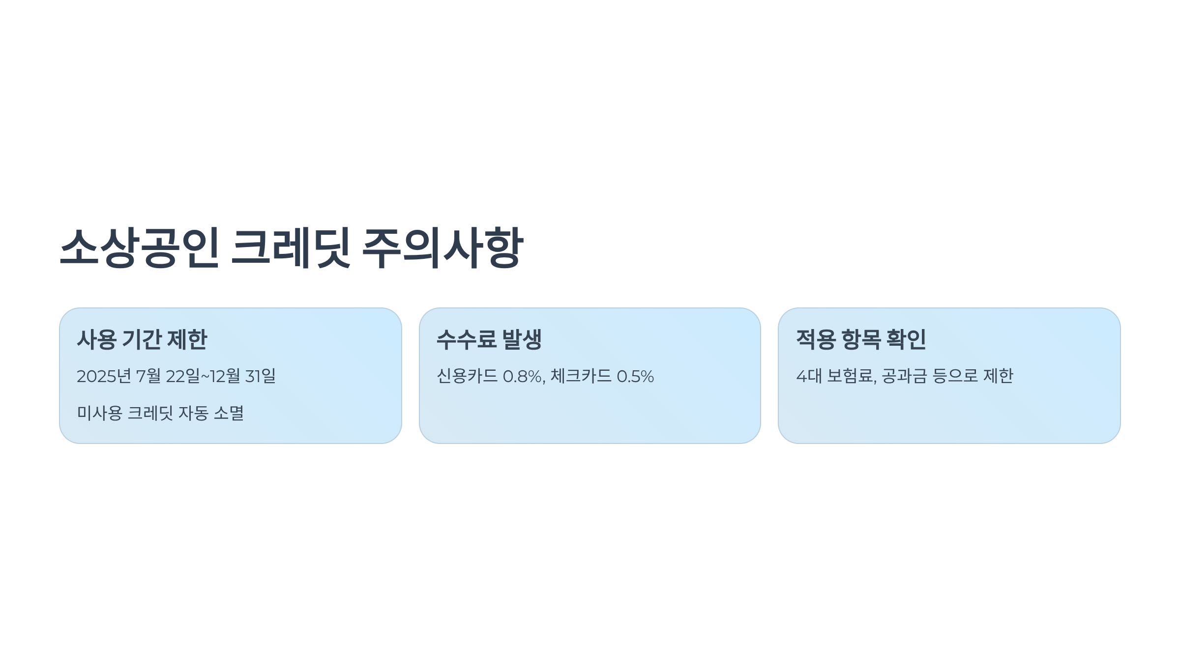 - 크레딧 적용 항목을 꼭 확인하세요: 카드 자동이체로 신청되더라도 모든 납부 항목에 소상공인 크레딧이 적용되는 것은 아닙니다. 주로 4대 보험료(국민연금, 건강보험), 전기료, 수도세, 가스요금 등으로 제한될 수 있습니다. 본인이 납부하려는 항목에 크레딧이 실제로 적용 가능한지는 소상공인 부담 경감 크레딧 공식 홈페이지나 관련 안내문을 통해 한 번 더 확인하는 것이 좋습니다.