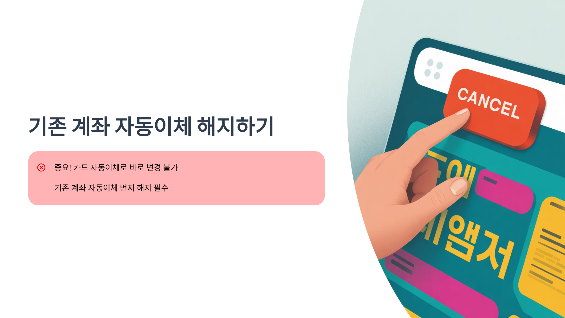 따라서 번거롭더라도 먼저 기존 계좌 자동이체를 해지한 후, 다시 카드 자동이체를 신규로 신청해야 해요. '자동이체 신청' 메뉴에서 '해지하기' 버튼을 눌러 기존 계좌 자동이체를 종료해 주세요. 해지 절차가 완료되었다는 메시지를 확인하셨다면, 이제 다시 '자동이체 신청하기'를 클릭하시면 됩니다. 이 점을 꼭 기억하시고 순서대로 진행해 주세요!