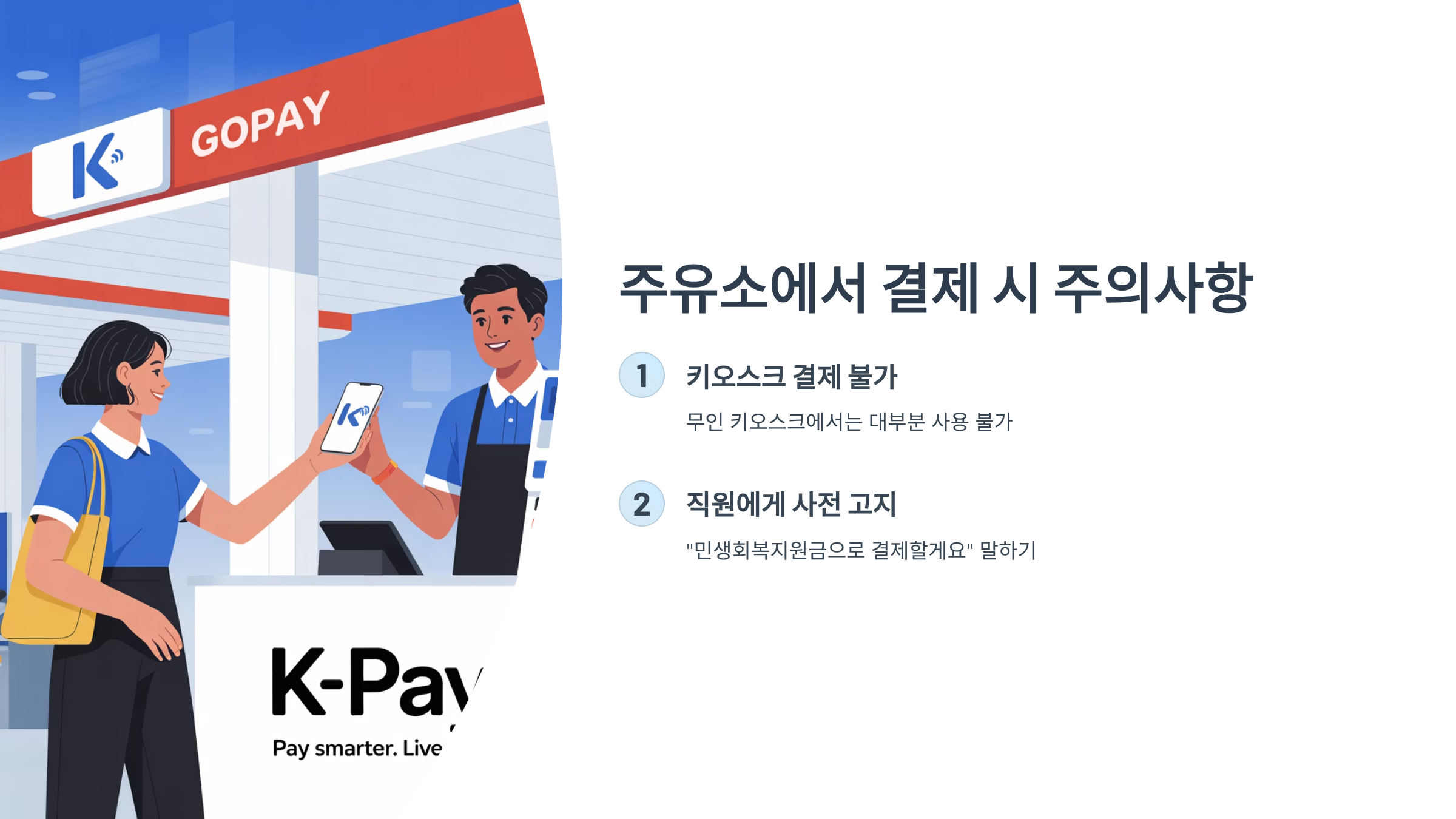 셋째, 키오스크 결제 시 유의해야 합니다. 대부분의 주유소에서 운영하는 무인 키오스크로는 민생회복지원금 결제가 안 되는 경우가 많습니다. 신용/체크카드 포인트로 지원금을 받은 경우에도 키오스크에서는 일반 결제로 처리될 수 있으니 주의가 필요합니다. 따라서 반드시 직원에게 "민생회복지원금으로 결제할게요"라고 말씀하신 후 카드 단말기를 통해 결제하셔야 합니다. 당황스러운 상황을 피하기 위해 미리 직원에게 문의하는 습관을 들이세요!