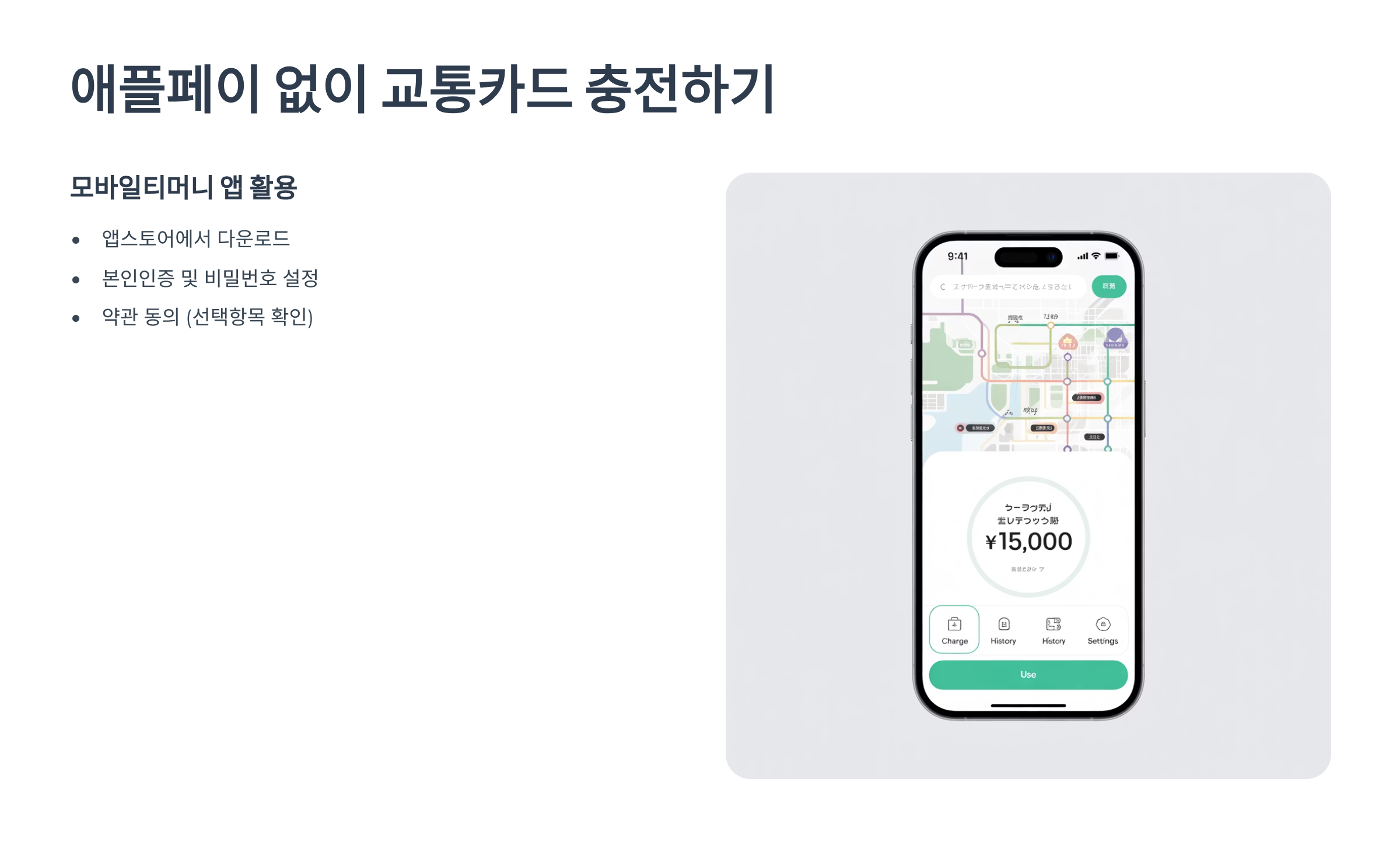 하지만 모든 아이폰 사용자가 현대카드를 가지고 있거나, 애플페이를 이용하는 건 아닐 거예요. 현대카드가 없거나, 혹은 애플페이 자체를 사용하지 않는 분들도 많습니다. 게다가 아직 신용카드 발급이 어려운 청소년들은 더욱 막막하게 느껴질 수 있는데요. 이럴 때도 아이폰으로 교통카드를 충전할 수 있는 방법이 있으니 너무 걱정하지 마세요. 바로 '모바일티머니' 앱을 활용하는 방법이랍니다.