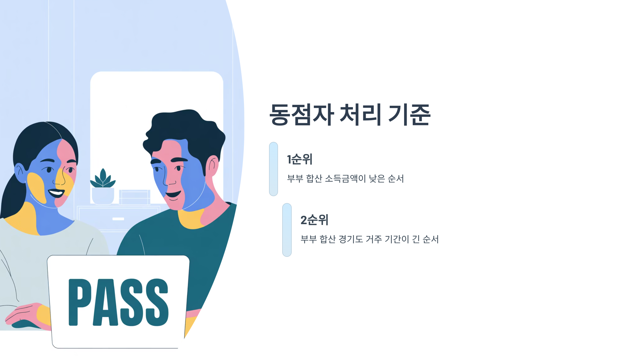 ① 부부 합산 소득금액이 낮은 순서, ② 부부 합산 경기도 거주 기간이 긴 순서로 우선 선정됩니다.