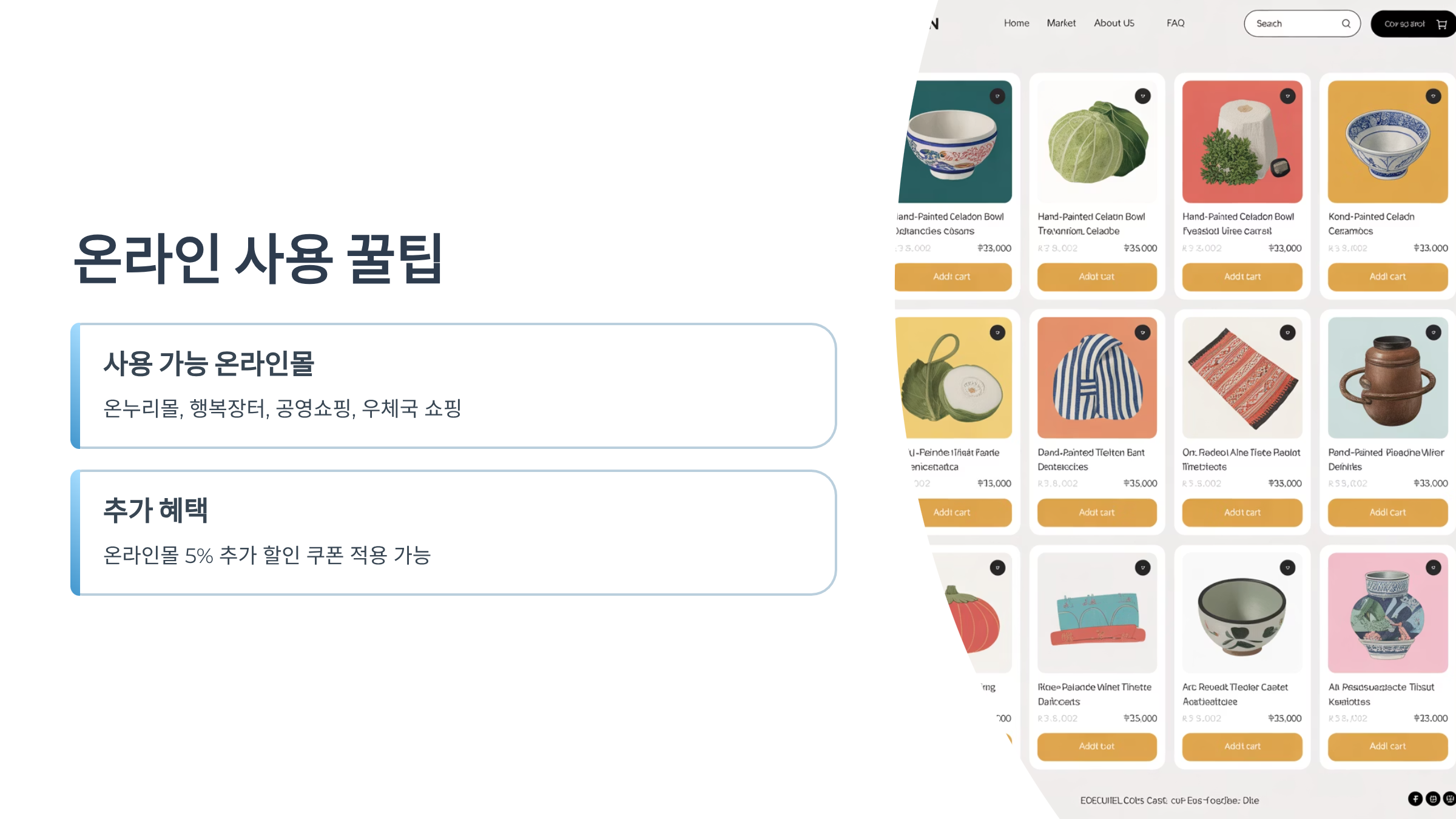 • 온라인 전용 추가 할인: 온라인 전통시장몰에서는 기본 할인 외에 5% 추가 할인 쿠폰을 적용할 수 있는 경우가 많아요. 이는 장바구니에 담긴 물품 가격을 한 번 더 할인받을 수 있는 기회입니다.