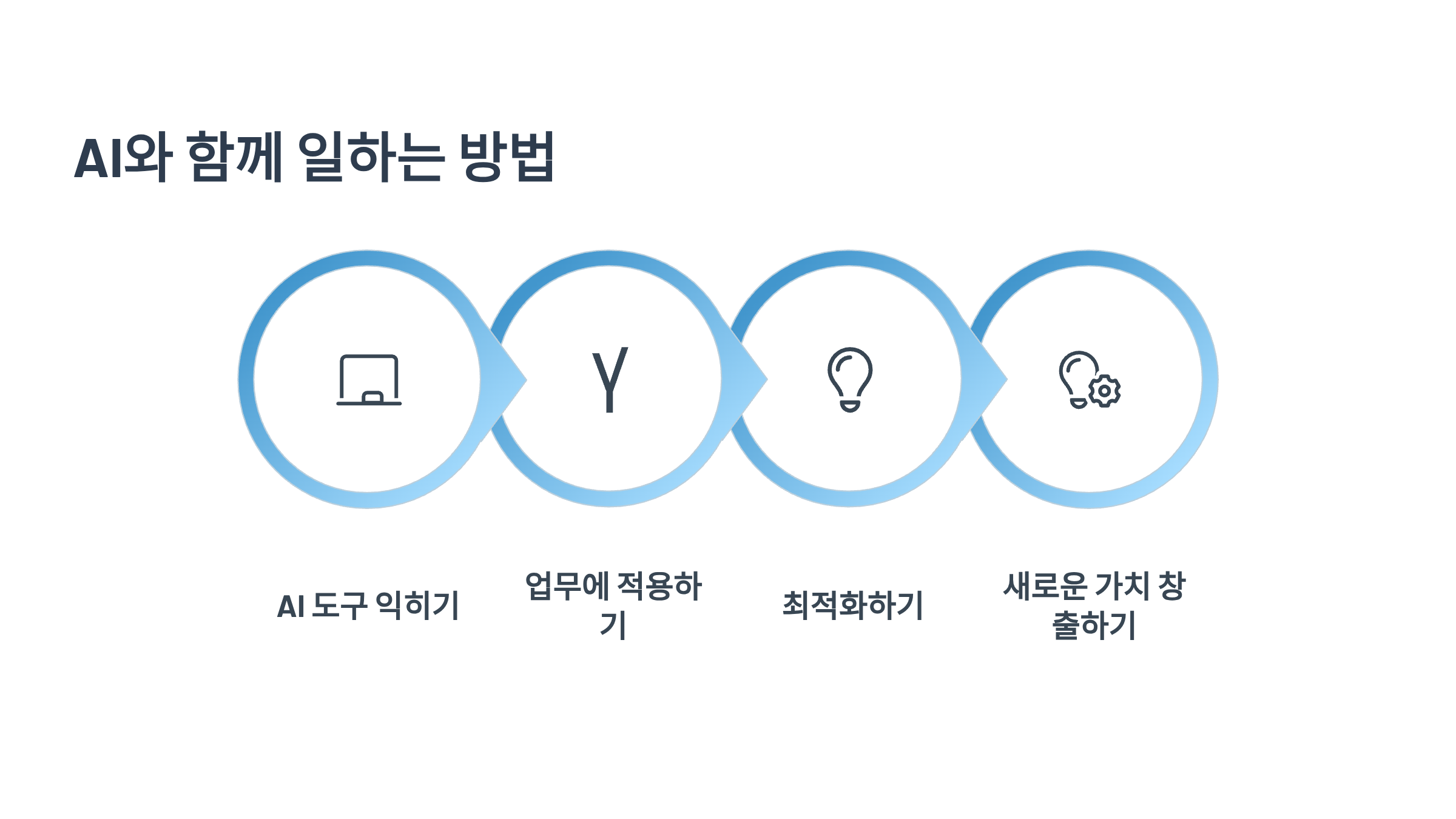 AI를 무시하는 사람은 가장 위험합니다. 가장 안전한 사람은 AI를 자신의 '보조 뇌'처럼 적극적으로 활용하는 사람입니다. ChatGPT, Copilot, Notion AI 등 다양한 AI 도구를 자신의 직무에 직접 통합하고 활용하는 방법을 익혀보세요. AI는 더 이상 선택이 아닌 필수적인 업무 도구입니다.