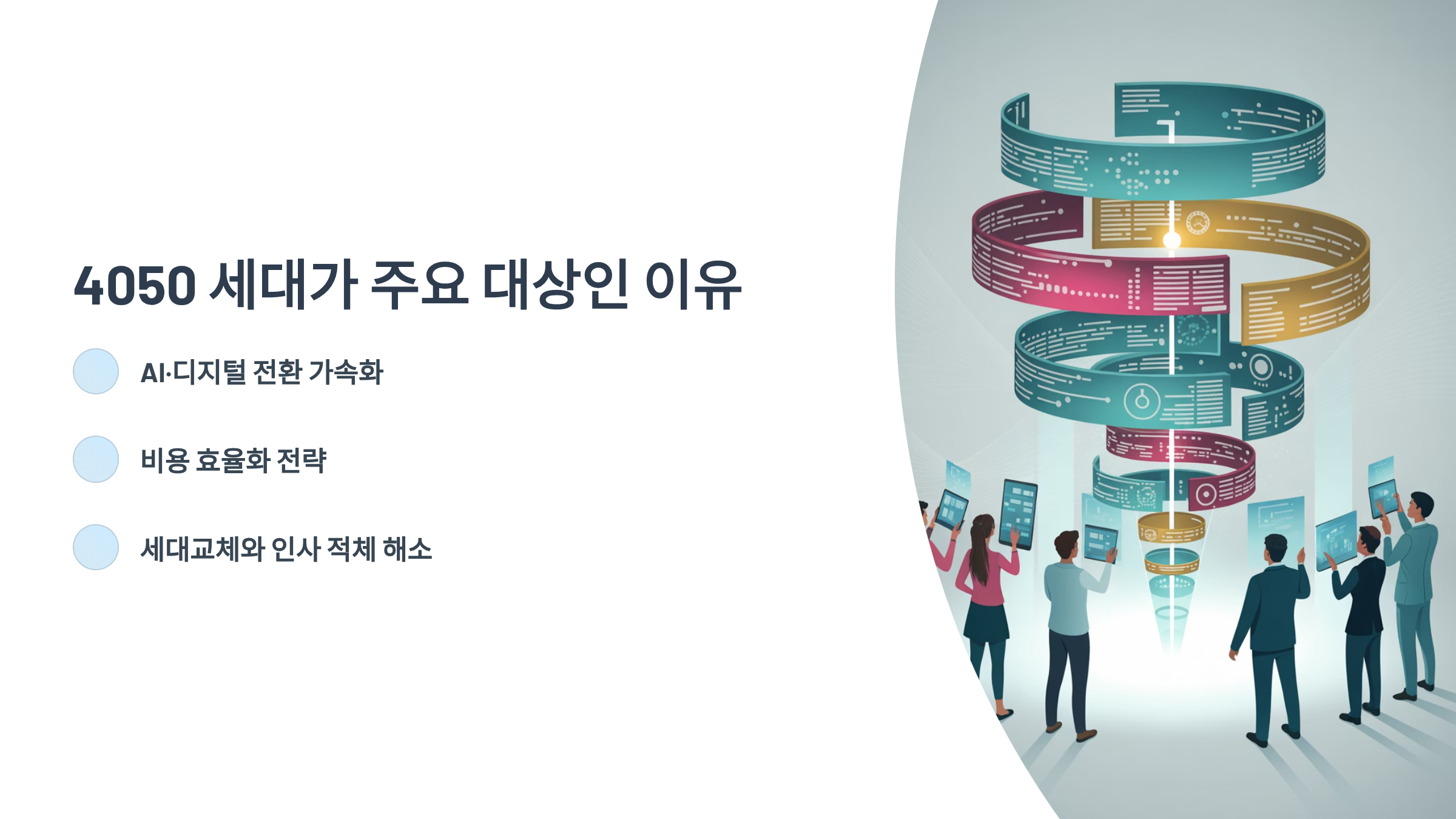 그렇다면 왜 지금, 40대~50대 관리자층이 희망퇴직의 주요 대상이 되는 걸까요? 가장 큰 배경으로는 기업들의 AI·디지털 전환 가속화와 비용 효율화 전략을 꼽을 수 있습니다. 기업들은 AI 활용을 늘리고 조직을 슬림화하여 유연성과 효율성을 높이려 합니다. 이 과정에서 상대적으로 인건비 부담이 큰 중견 관리층의 인력 감축을 통해 비용 절감 효과를 노리는 것이죠. 또한, 국내 기업의 경우 세대교체와 인사 적체 해소라는 내부적 목적도 희망퇴직을 부추기는 요인으로 작용하고 있습니다.