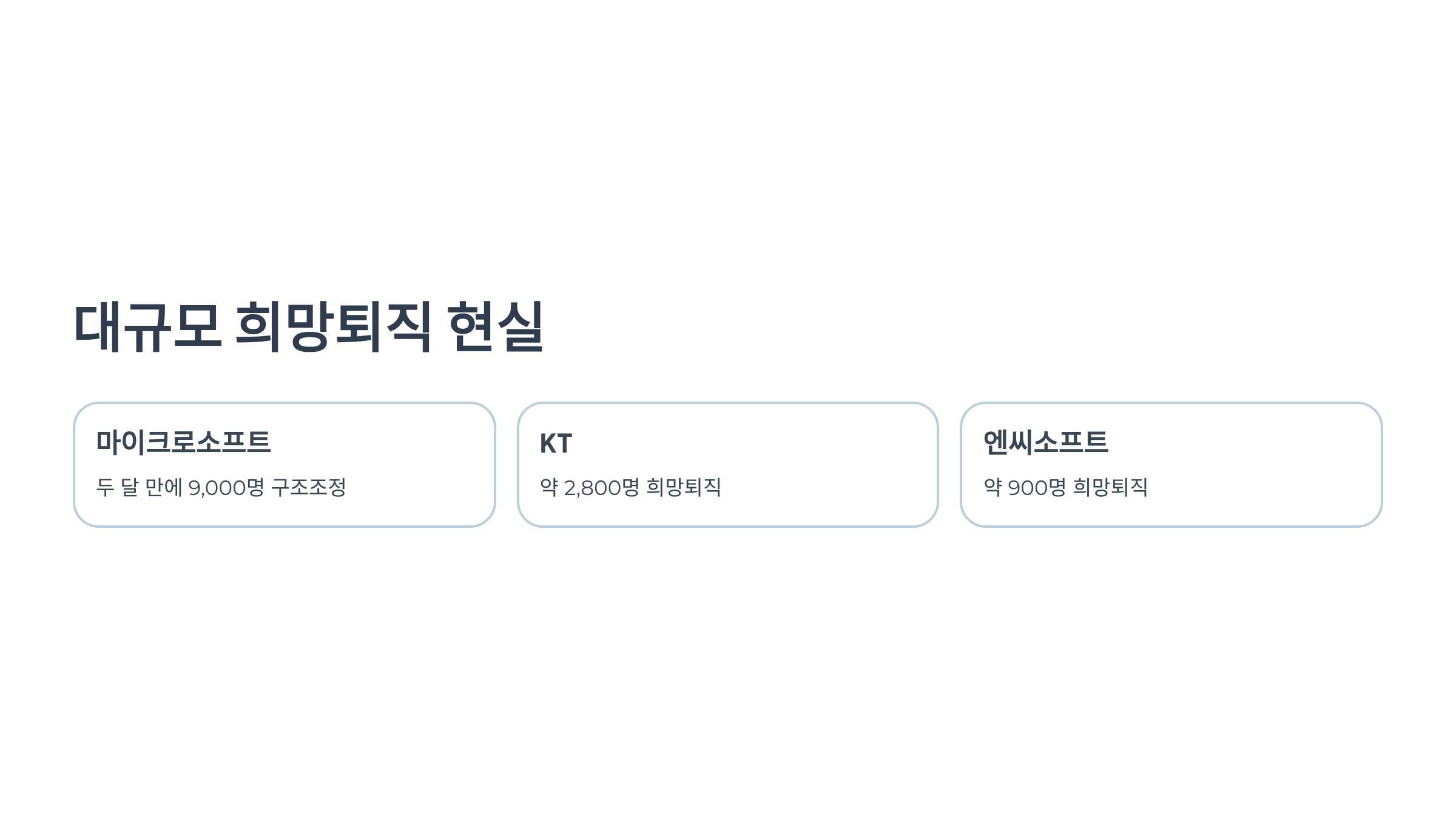 국내 기업들도 예외는 아닙니다. KT는 약 2,800명의 대규모 희망퇴직을 실시했고, LG유플러스는 만 50세 이상 10년 이상 근속자를 대상으로 연봉의 3배에 달하는 파격적인 위로금과 자녀 학자금까지 지원하며 희망퇴직을 단행했습니다. SK텔레콤 역시 50대 이상 직원을 대상으로 기존 5,000만 원이던 퇴직 위로금을 최대 3억 원으로 인상하며 세대교체에 나섰고, 국내 최대 게임업체 엔씨소프트도 약 900명의 희망퇴직을 통해 본사 인력을 대폭 줄였습니다.