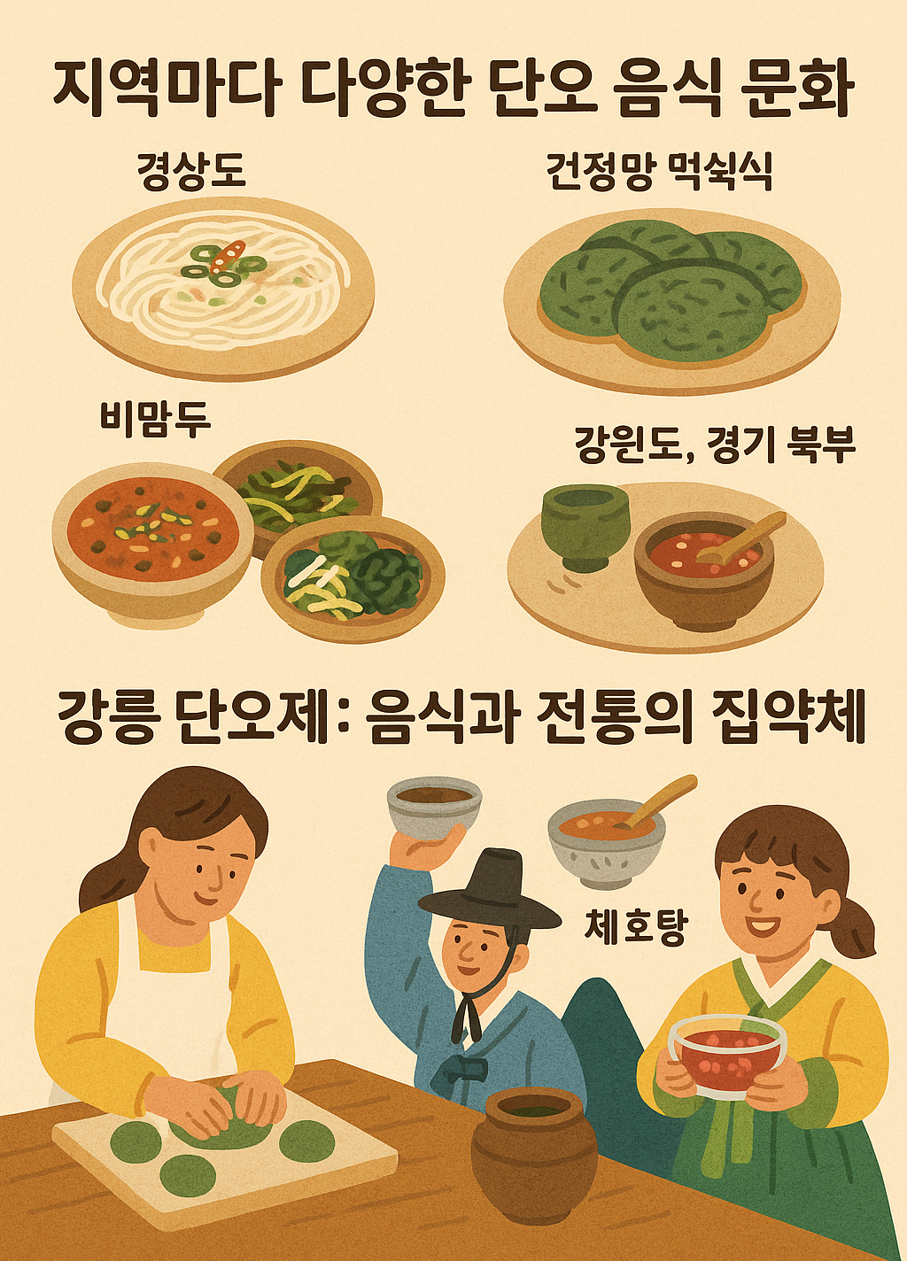 단오날 먹는 음식은 지역에 따라 조금씩 다르다. 경상도에선 밀국수와 함께 약쑥을 넣은 부침개가 일반적이며, 전라도에선 고추장을 푼 비빔청국장과 다양한 제철 나물로 상차림을 차리는 경우도 있다. 강원도와 경기 북부 지역에선 수리취떡이 가장 대표적이다.