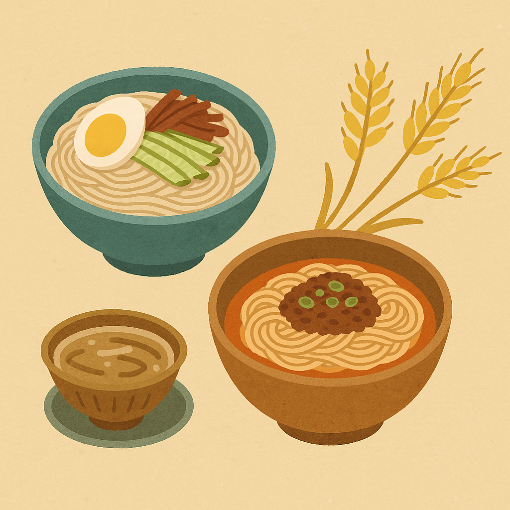 단오 즈음은 밀의 수확 시기와 겹치기 때문에 전통적으로 밀국수나 냉면 같은 면요리도 단옷날 먹는 음식으로 자리잡았다. 특히 냉면은 더운 여름에 어울리는 시원한 음식이라 각 가정에서도 단오상을 차릴 때 종종 포함되었다. 간장 국물에 오이, 김가루, 계란 등을 얹어 시원하게 즐기는 방식이 일반적이며, 이는 여름철 떨어지기 쉬운 입맛을 되살려주는 효과가 있다.