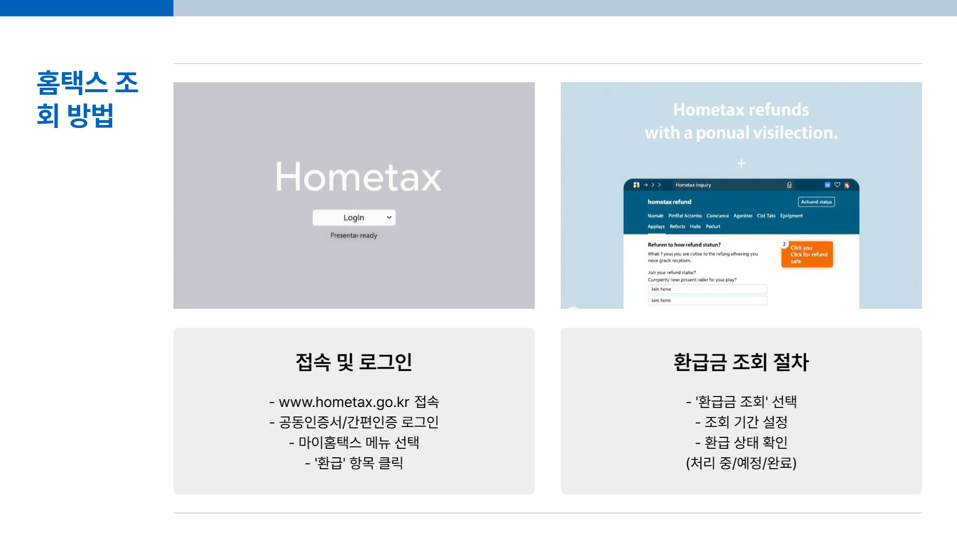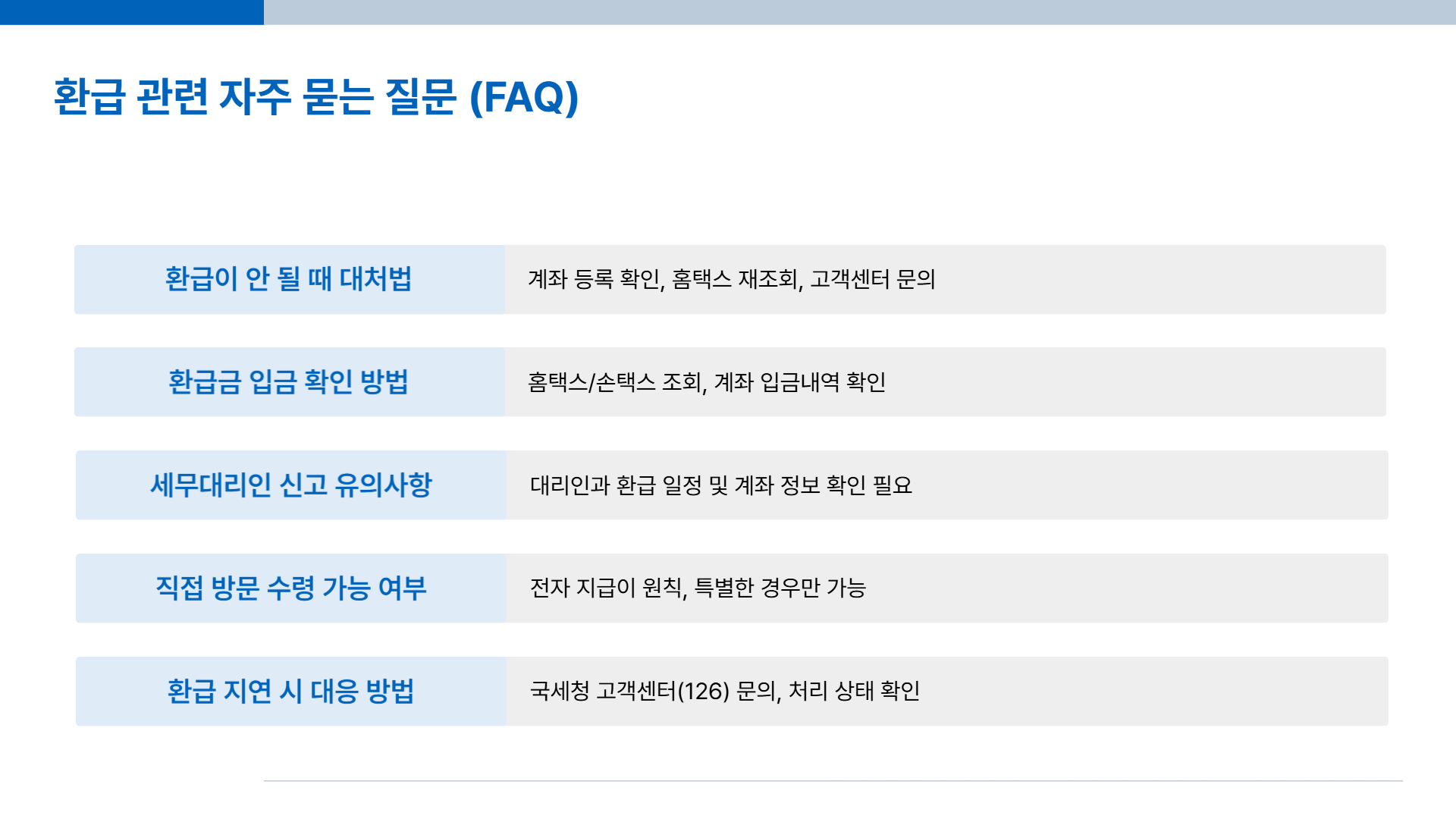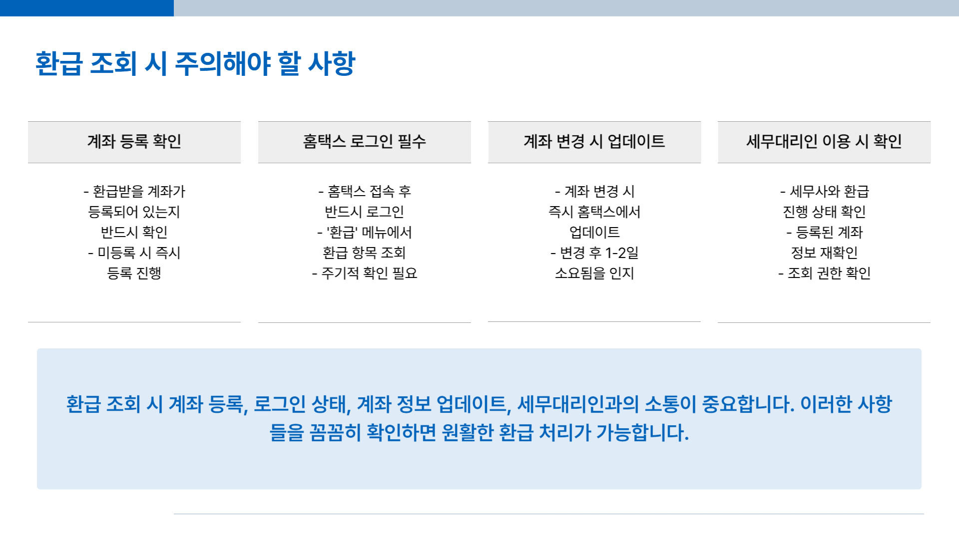 → 계좌 등록 여부, 환급 대상 여부, 홈택스 환급금 조회 항목을 다시 확인해 보세요. 문제가 지속되면 국세청 고객센터(국번 없이 126)에 문의하면 해결이 빠릅니다.
