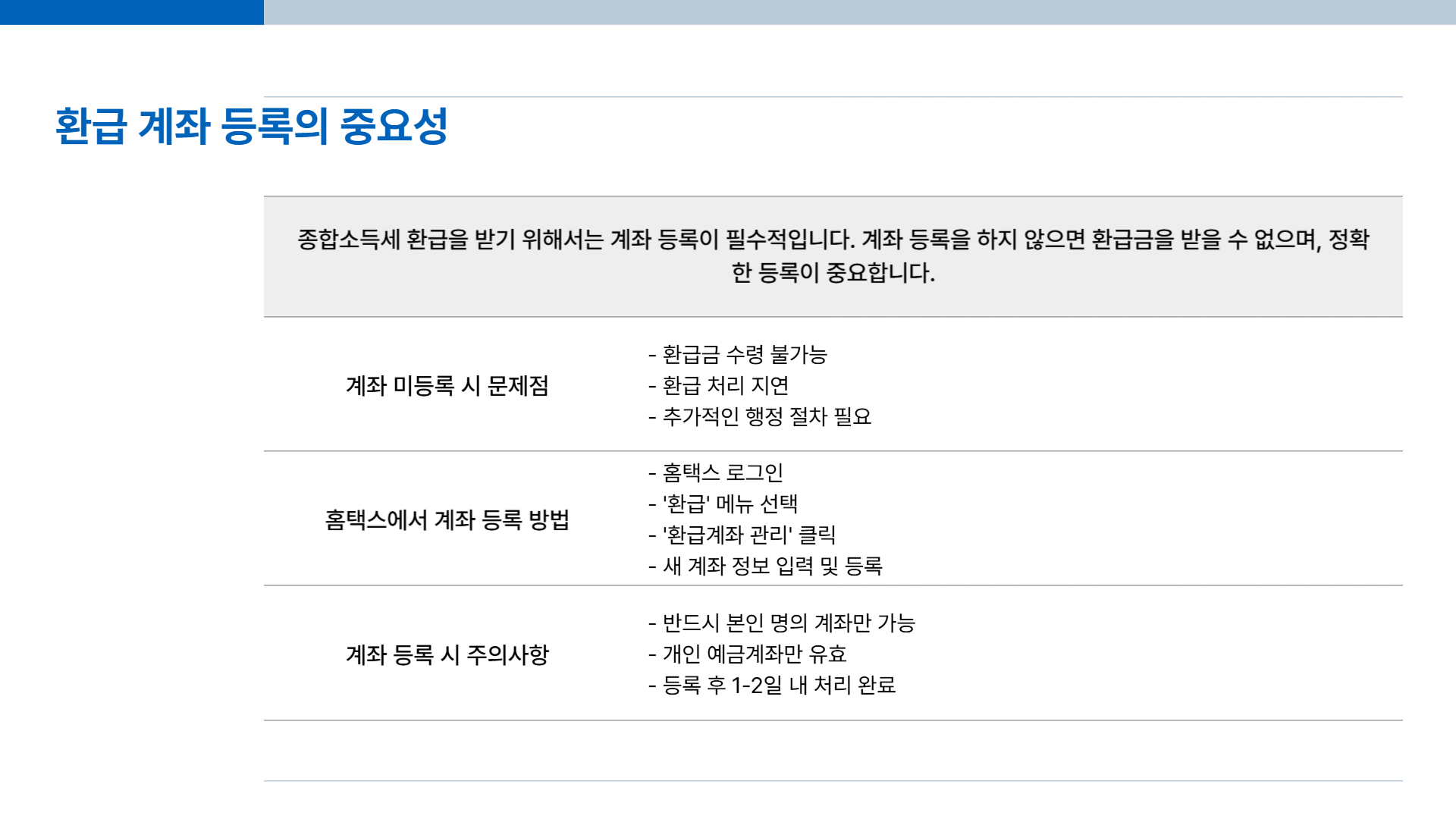 종합소득세 환급일 조회 과정에서 가장 흔하게 발생하는 문제 중 하나가 바로 환급 계좌 미등록입니다.