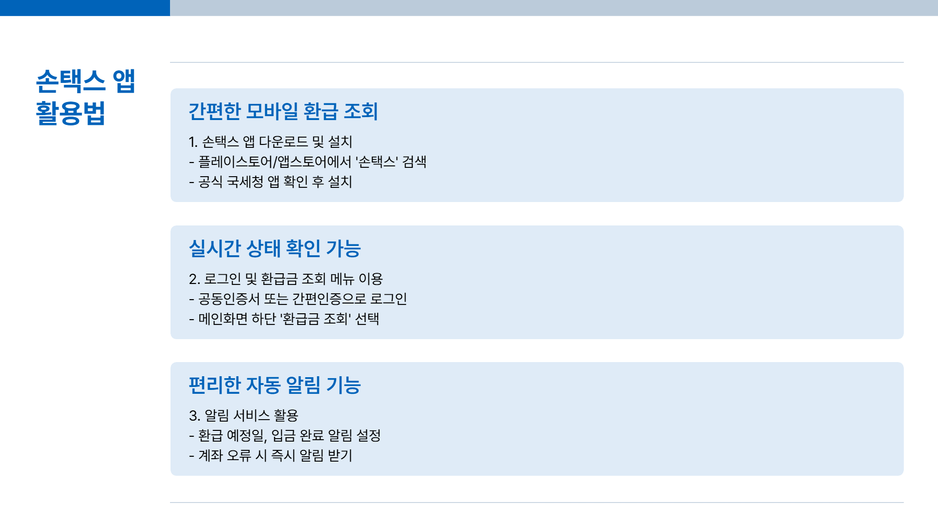 손택스의 장점은 단순한 조회 기능을 넘어 ‘알림 서비스’도 있다는 점입니다. 알림 설정을 해두면 환급금 입금 예정일, 계좌 오류 발생 시 알림, 지급 완료 시 문자 알림까지 받을 수 있어 매우 유용합니다.