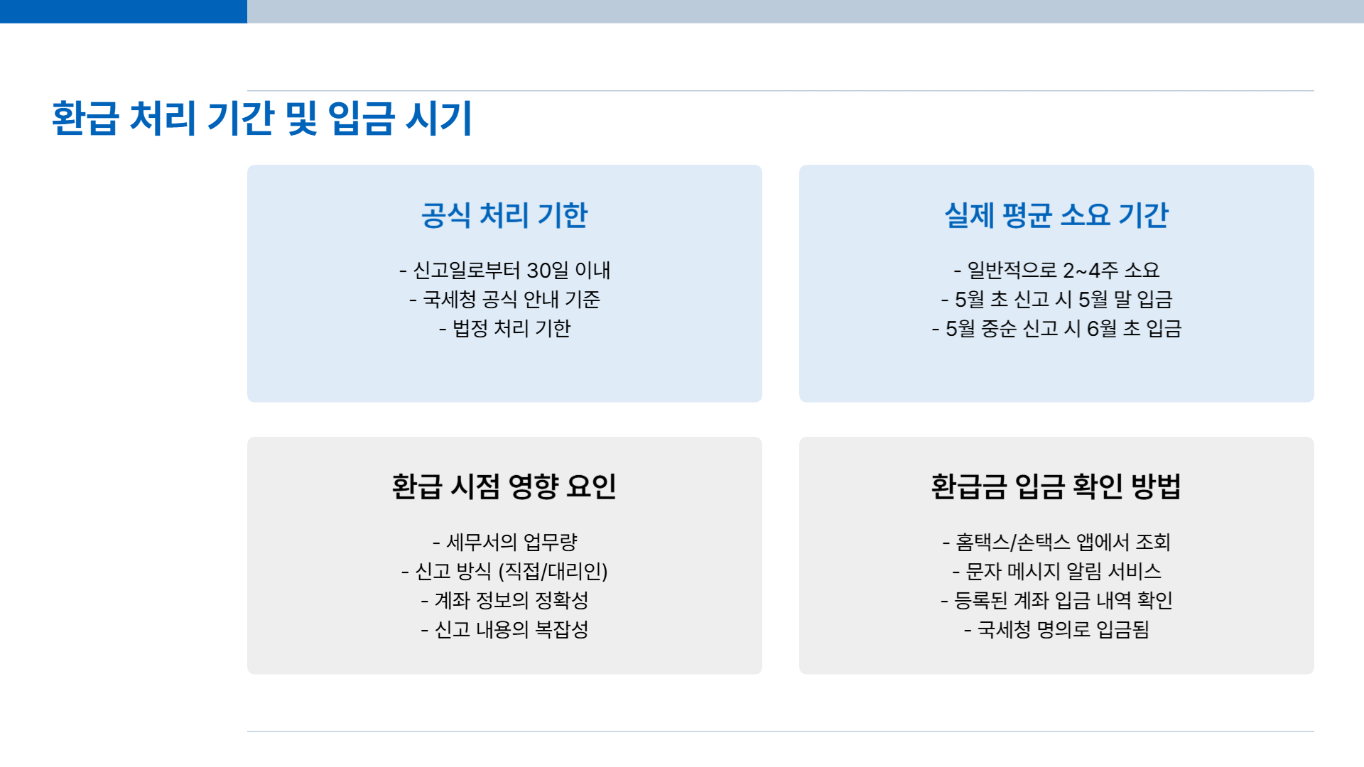 환급 시점은 세무서마다 조금씩 다르며, 지역 세무서의 업무량, 신고 방식(직접/세무대리인) 등에 따라 달라질 수 있습니다. 특히 세무사나 플랫폼을 통한 간편 신고를 했다면, 그쪽에서 대리 입력한 정보에 따라 반영이 약간 늦어질 수 있습니다.