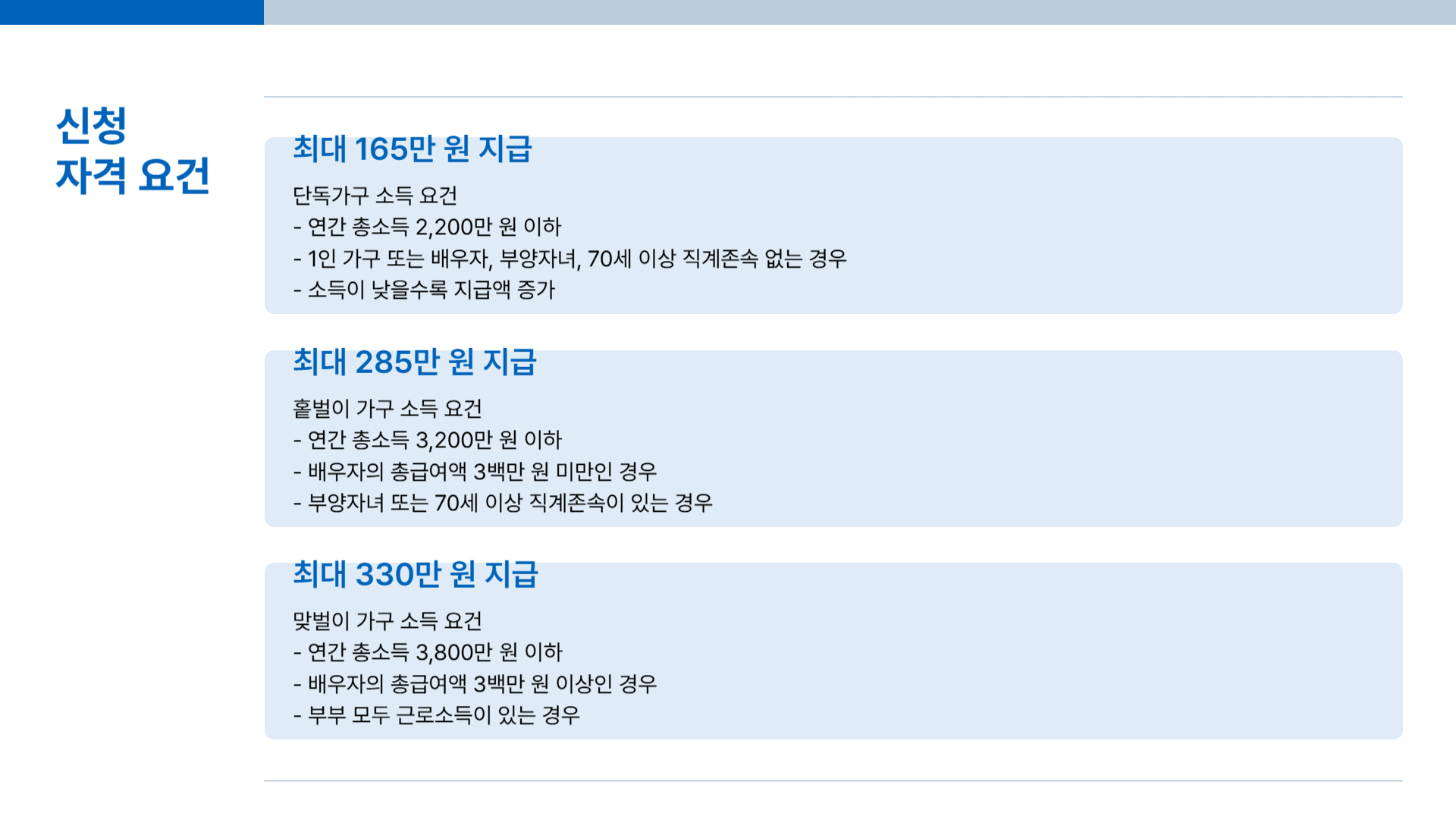 - 단독가구: 연간 총소득 2,200만 원 이하