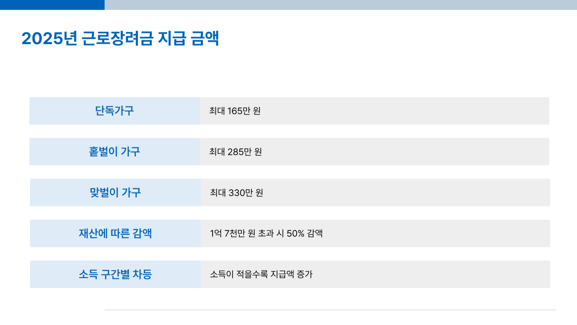 2025년 기준 근로장려금 최대 지급 금액은 다음과 같습니다.