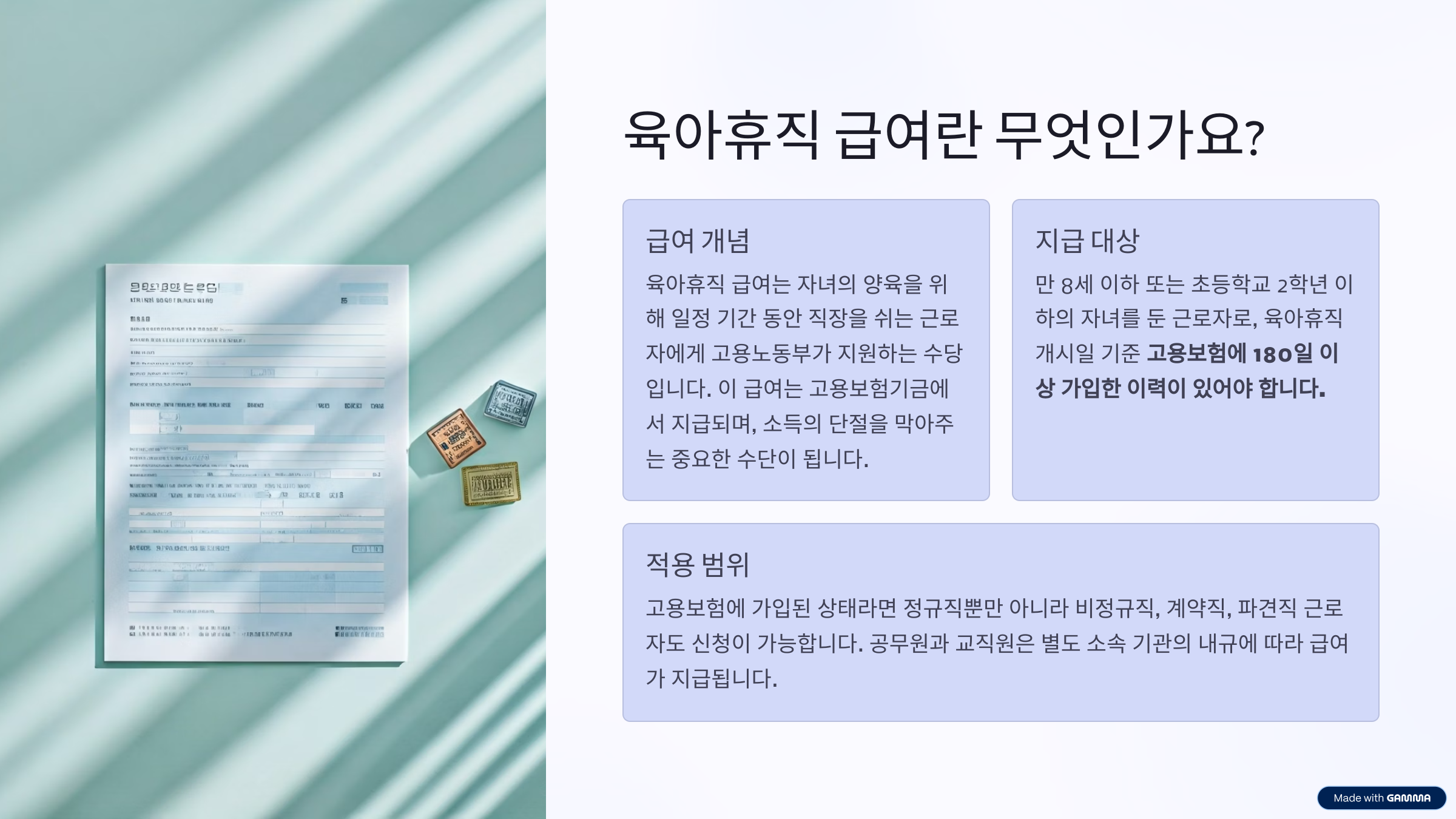 아이를 낳고 기르면서 직장을 병행하는 부모라면 누구나 한 번쯤은 육아휴직을 고민하게 됩니다. 특히 생계를 책임지는 맞벌이 부부의 경우, 휴직 기간 동안의 경제적 부담이 가장 큰 고민 중 하나입니다. 이럴 때 도움이 되는 것이 바로 ‘육아휴직 급여’입니다. 이 제도는 단순한 휴식이 아니라, 육아와 경력을 모두 이어갈 수 있게 해주는 제도적 장치입니다.