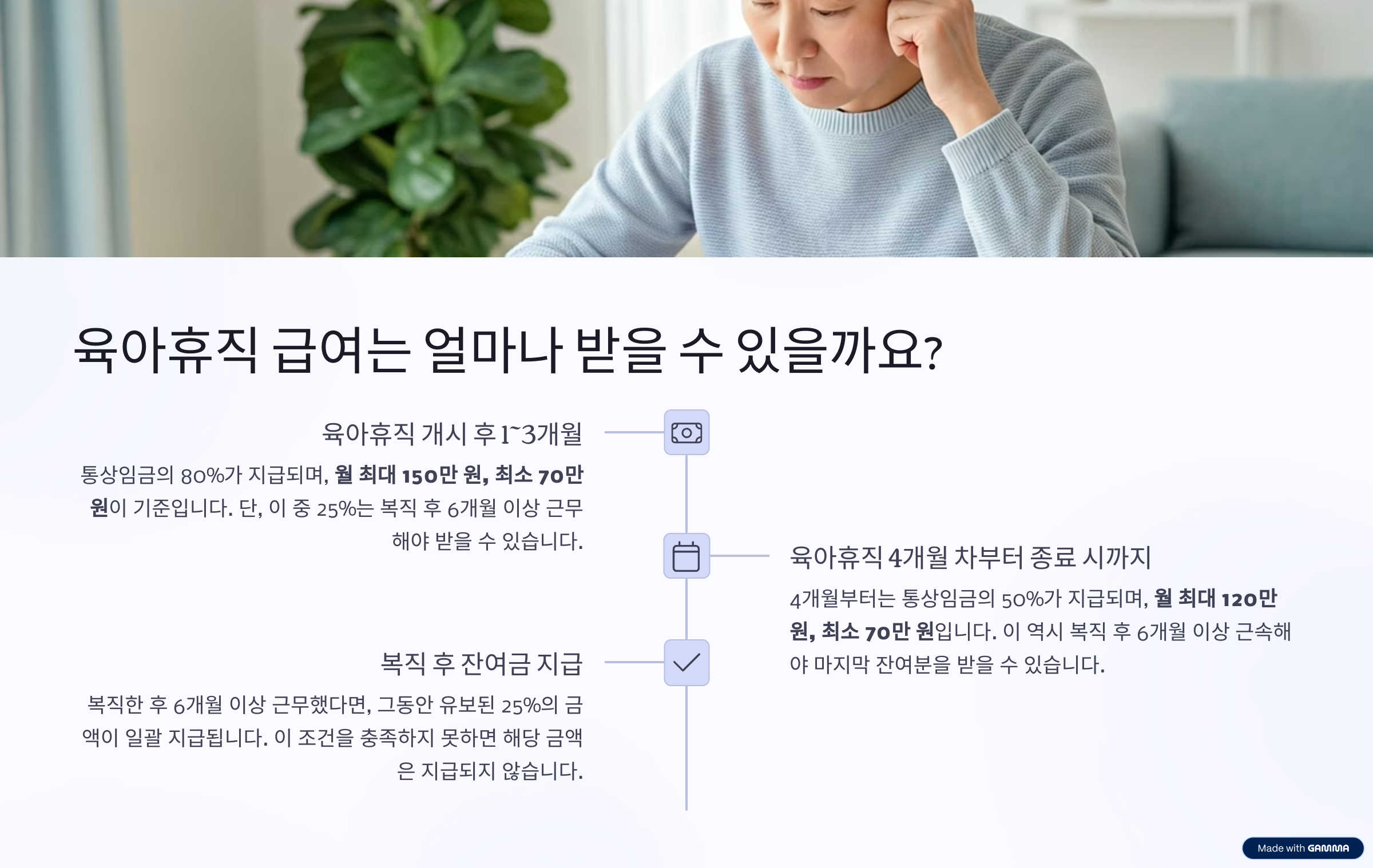 이 기간에는 통상임금의 80%가 지급되며, 월 최대 150만 원, 최소 70만 원이 기준입니다. 단, 이 중 25%는 복직 후 6개월 이상 근무해야 받을 수 있습니다. 예를 들어 월급이 250만 원이라면 첫 3개월간 매월 150만 원까지 받을 수 있으며, 37.5만 원은 복직 후 별도로 지급됩니다. - 육아휴직 4개월 차부터 종료 시까지