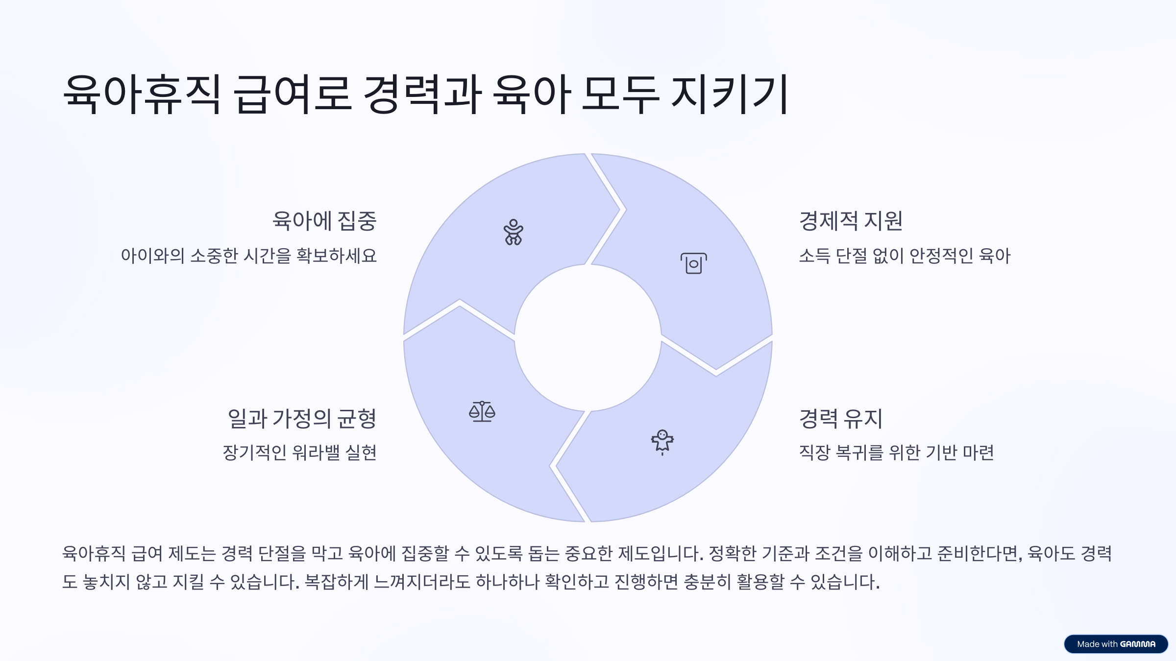 육아휴직 급여 제도는 경력 단절을 막고 육아에 집중할 수 있도록 돕는 중요한 제도입니다. 정확한 기준과 조건을 이해하고 준비한다면, 육아도 경력도 놓치지 않고 지킬 수 있습니다. 복잡하게 느껴지더라도 하나하나 확인하고 진행하면 충분히 활용할 수 있습니다.