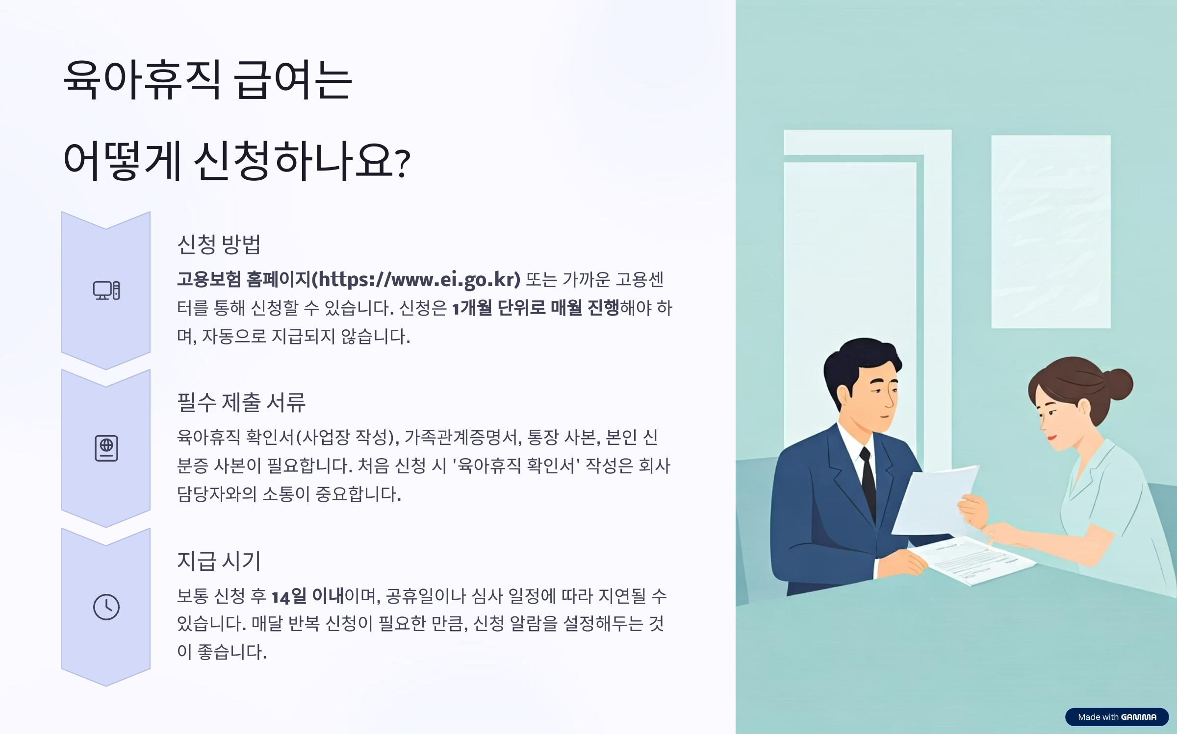 회사에서 발급해주는 복직확인서를 제출하지 않으면 잔여급이 지급되지 않으므로, 복직 후 꼭 챙기셔야 합니다. - 급여 지급은 매달 반복 신청이 기본입니다. 신청을 깜빡할 경우 해당 월 급여가 지급되지 않거나 지급 지연이 발생할 수 있습니다.