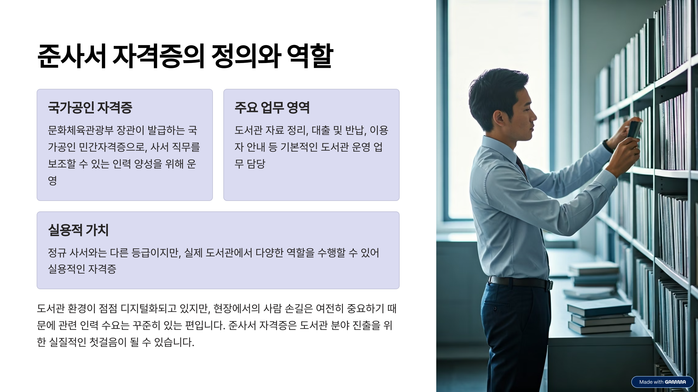 도서관 준사서 자격증은 문화체육관광부 장관이 발급하는 국가공인 민간자격증으로, 사서 직무를 보조할 수 있는 인력을 양성하기 위해 운영되고 있습니다. 주로 도서관 자료 정리, 대출 및 반납, 이용자 안내 등 기본적인 도서관 운영 업무에 투입될 수 있습니다. 정규 사서와는 다른 등급이지만, 실제 도서관에서는 많은 역할을 수행할 수 있다는 점에서 실용적인 자격증입니다. 도서관 환경이 점점 디지털화되고 있지만, 현장에서의 사람 손길은 여전히 중요하기 때문에 관련 인력 수요는 꾸준히 있는 편입니다.