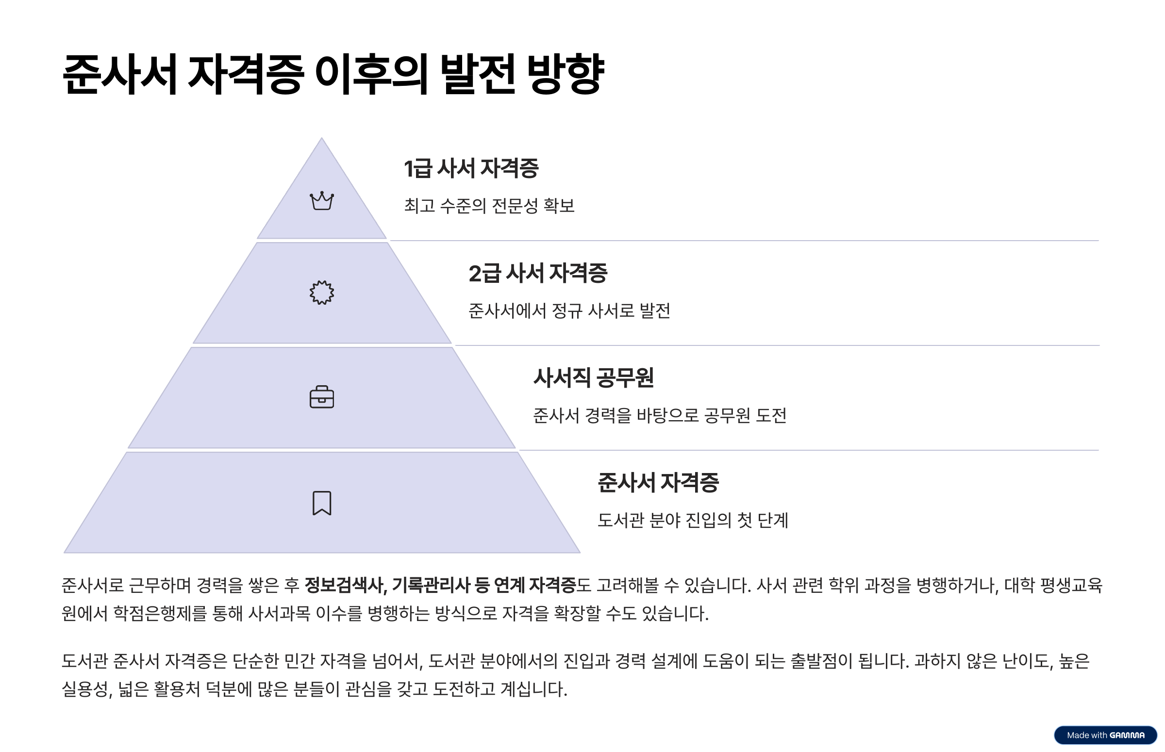 도서관 관련 진로를 고민하고 계신다면, 도서관 준사서 자격증은 현실적인 선택지 중 하나입니다. 과하지 않은 난이도, 높은 실용성, 넓은 활용처 덕분에 많은 분들이 관심을 갖고 도전하고 계십니다. 도서관 현장에서 직접 일해보고 싶은 분들께는 경험과 자격을 동시에 챙길 수 있는 좋은 기회가 될 것입니다. 지금부터 차근차근 준비해 보시면, 충분히 현실적인 결과를 만들어내실 수 있습니다.