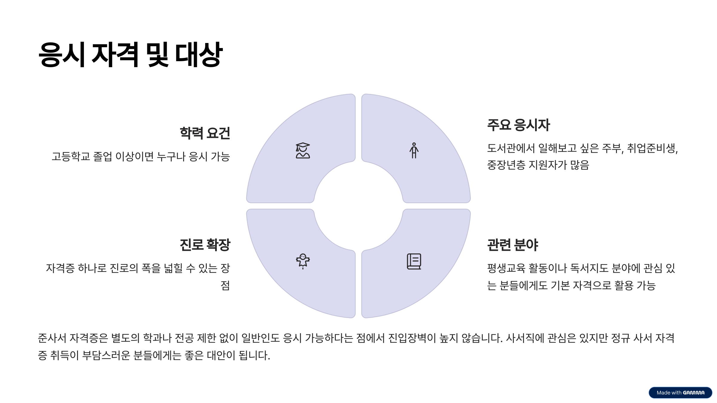도서관 준사서 자격증은 고등학교 졸업 이상이면 누구나 응시할 수 있습니다. 별도의 학과나 전공 제한 없이 일반인도 응시 가능하다는 점에서 진입장벽이 높지 않습니다. 특히 도서관에서 일해보고 싶은 주부, 취업준비생, 중장년층 지원자도 많은 편입니다. 사서직에 관심은 있지만 정규 사서 자격증 취득이 부담스러운 분들에게는 좋은 대안이 됩니다. 또한, 평생교육과 관련된 활동이나 독서지도 분야에 관심 있는 분들에게도 기본 자격으로 활용될 수 있습니다. 자격증 하나로 진로의 폭을 넓힐 수 있다는 점이 가장 큰 장점입니다.