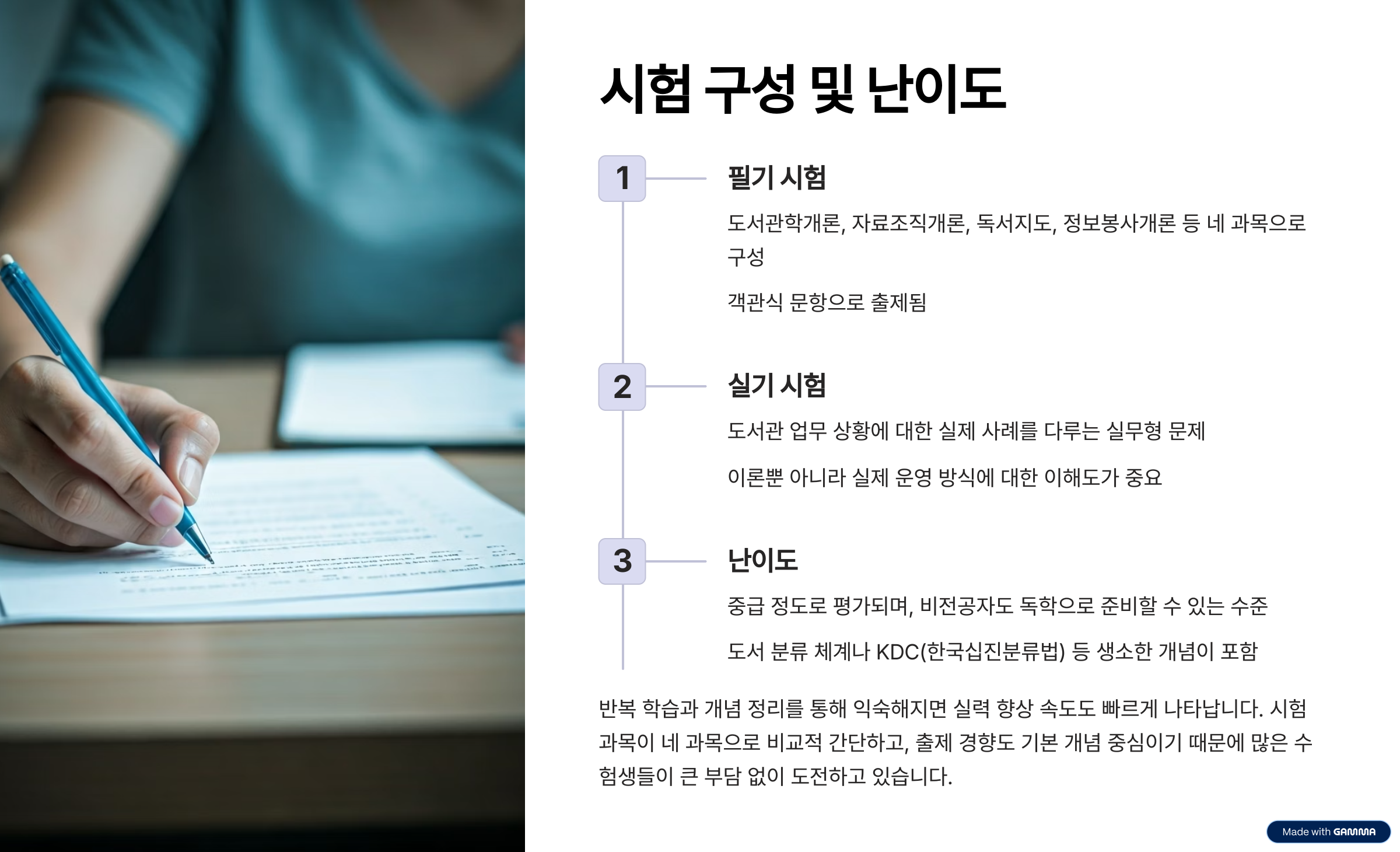 시험은 필기와 실기 두 부분으로 구성되어 있습니다. 필기 과목은 도서관학개론, 자료조직개론, 독서지도, 정보봉사개론 등 네 과목으로 구성되어 있으며, 객관식 문항으로 출제됩니다. 실기는 도서관 업무 상황에 대한 실제 사례를 다루는 실무형 문제로, 이론뿐 아니라 실제 운영 방식에 대한 이해도가 중요합니다. 난이도는 중급 정도로 평가되며, 비전공자도 독학으로 준비할 수 있는 수준입니다. 다만, 도서 분류 체계나 KDC(한국십진분류법) 등 생소한 개념이 포함되어 있기 때문에 초반에는 낯설 수 있습니다. 반복 학습과 개념 정리를 통해 익숙해지면 실력 향상 속도도 빠르게 나타납니다.