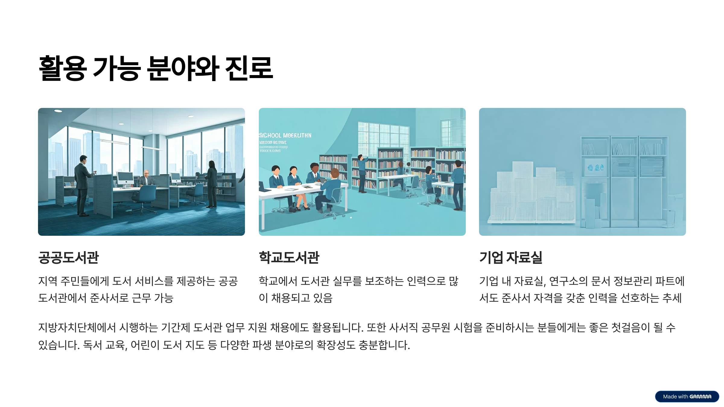 도서관 준사서 자격증을 취득하시면 공공도서관, 대학도서관, 학교도서관, 전문자료실 등 다양한 기관에서 근무하실 수 있습니다. 특히 학교에서 도서관 실무를 보조하는 인력으로 많이 채용되고 있으며, 지방자치단체에서 시행하는 기간제 도서관 업무 지원 채용에도 활용됩니다. 또한 사서직 공무원 시험을 준비하시는 분들에게는 좋은 첫걸음이 될 수 있습니다. 최근에는 도서관 외에도 기업 내 자료실, 연구소의 문서 정보관리 파트에서도 준사서 자격을 갖춘 인력을 선호하는 추세입니다. 독서 교육, 어린이 도서 지도 등 다양한 파생 분야로의 확장성도 충분합니다.