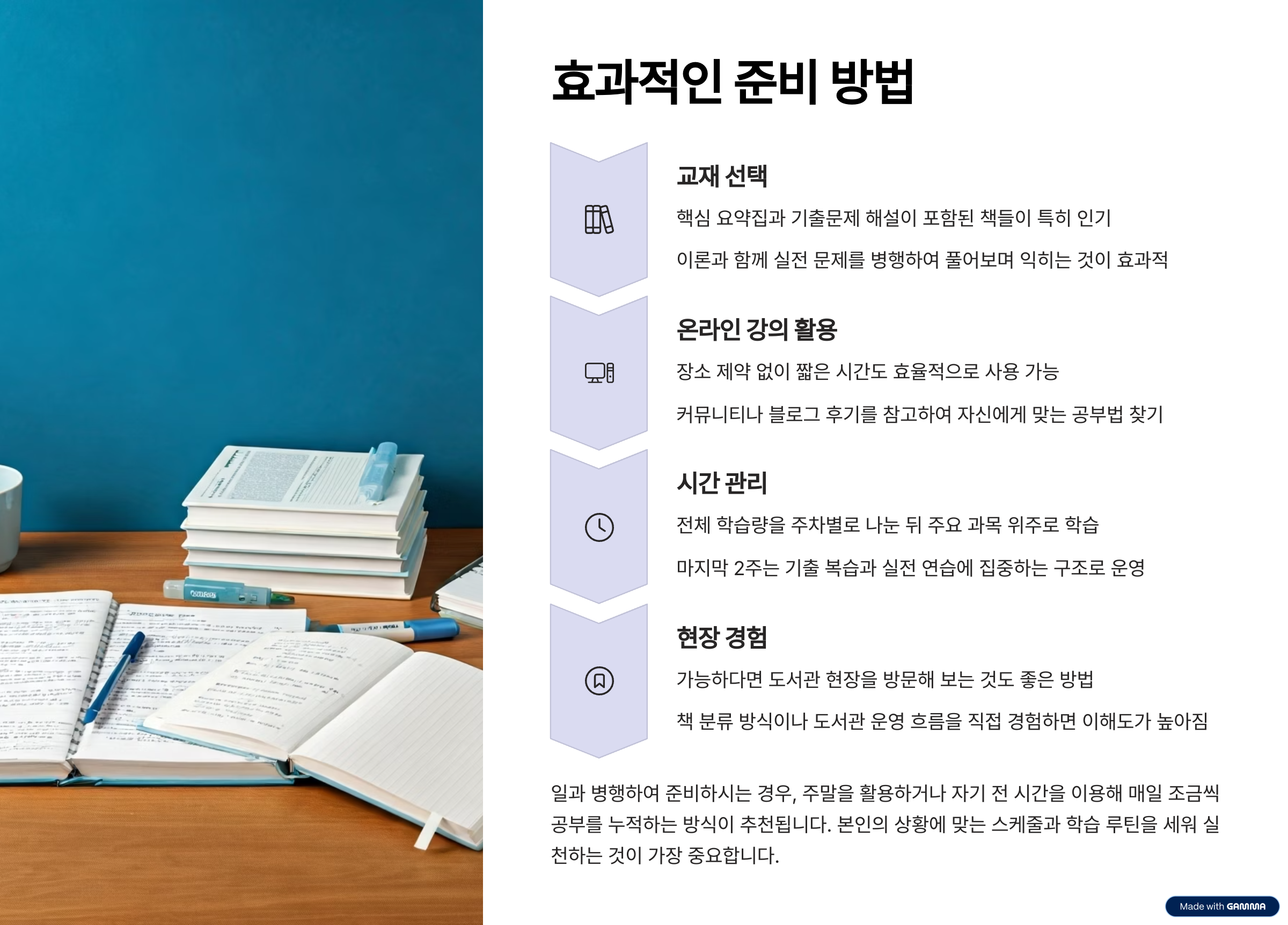 학습 계획을 세우실 때는 전체 학습량을 주차별로 나눈 뒤 주요 과목 위주로 학습하고, 마지막 2주는 기출 복습과 실전 연습에 집중하는 구조로 운영하는 것이 좋습니다. 본인의 상황에 맞는 스케줄과 학습 루틴을 세워 실천하시는 것이 가장 중요합니다.